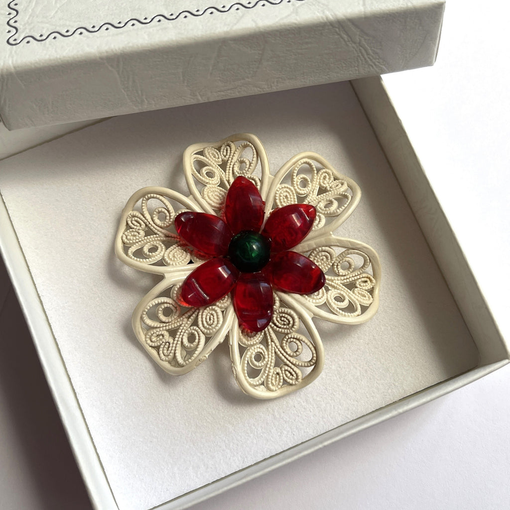 Quite a large dress clip at 6cms across the centre. A flower head of six white filigreed plastic petals with six glossy red petals centred with a dark green bead.  The V shaped mechanism at the back is firm.  Gorgeous at the V of a neckline, or on a lapel or headband....easily doubles as a brooch with a definite look back in time.  In very good condition, gift boxed by Vintageonline.