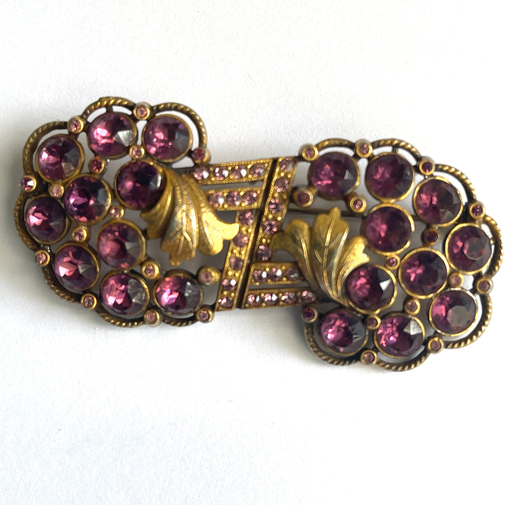 Fully faceted purple rhinestones combined with channel set paler purple stones embellished with gold tone acanthus leaf design. During the 1930's period the Duette style of brooches became popular where two pieces could be separated to be worn as dress clips. From the front appearance of this lovely vintage brooch it does look like it could be a Duette, but it is actually a one piece brooch. Overall dimension is 7cms x 3cms. A firm roll over safety clasp to the back. In very good condition with a little wear to the back commensurate with its 80 year age. An elegant timeless piece, gift boxed by Vintageonline.
