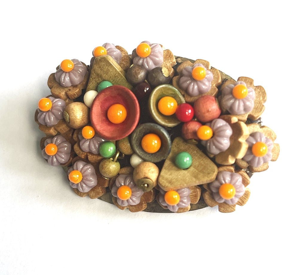 During the 1940's materials for costume jewellery was scarce and this brought about much imagination to utilize the materials to hand. This interesting brooch has been put together with small pieces of carved wood embellished with tiny plastic floral pieces. Overall size is 5cms x 3.5cms. It is in good condition considering it is now almost 80 years old. A recent acquisition from the UK. A little wear to the back but nothing that detracts from this lovely nostalgic piece. Gift boxed by Vintageonline.