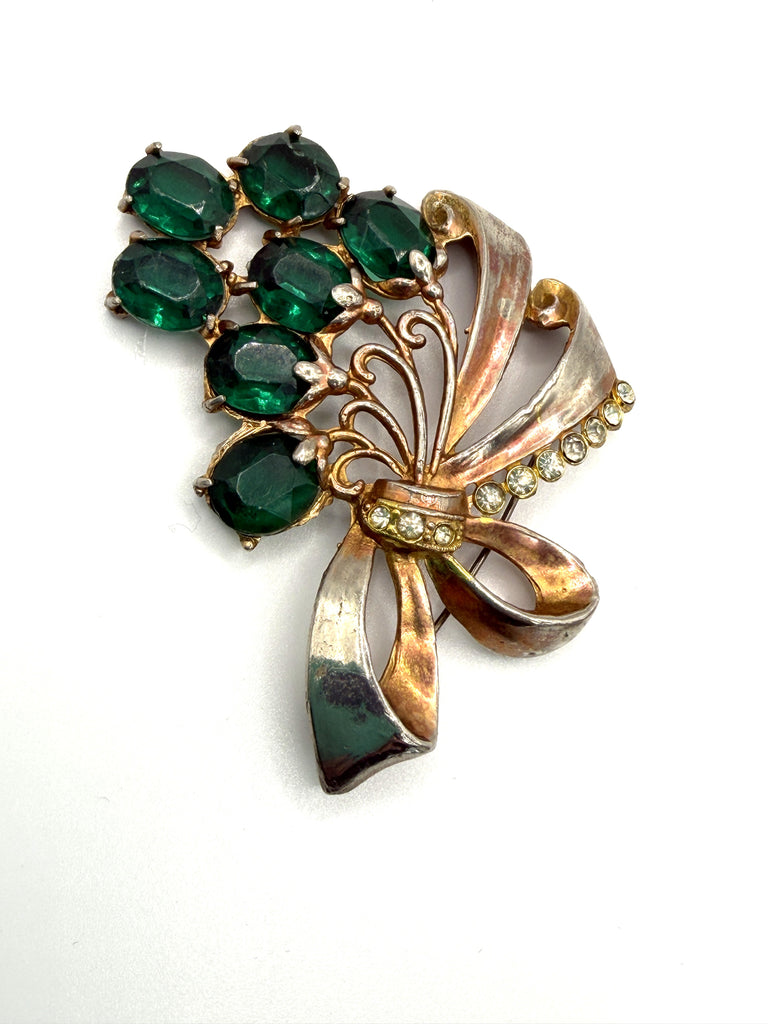 A striking 1940's brooch featuring rich green prong set and faceted stones set in a bold sculptural ribbon design typical of the era. It is a piece that reflects the glamour and the resilience of war time fashion. Various metals were used for jewellery during that time as many precious metals were not easy to obtain. This brooch has a rose gold effect to the metal. It is quite large at 7cms x 5cms. There is a firm roll over safety clasp to the back. It is in good condition. From an estate sale USA. True vintage and beautifully made, gift boxed by Vintageonline.