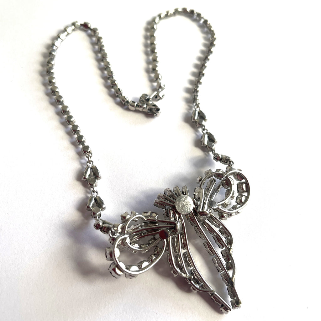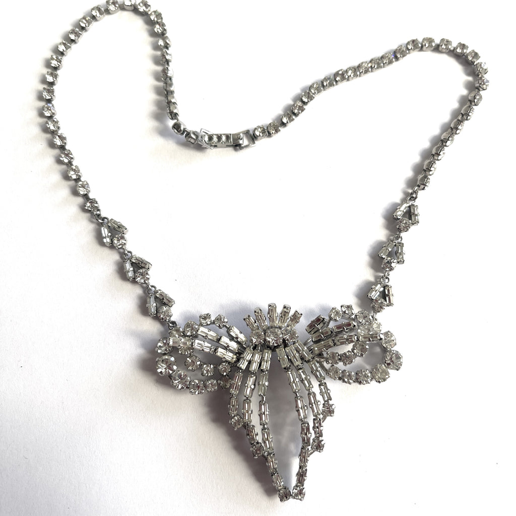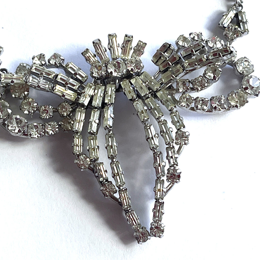 Beautiful quality rhinestone necklace and earrings from times past.  Clear rhinestones always dress up any outfit and this beautiful set is in perfect condition and now around 70 years old. No signature (many of the high end costume jewellery designers worked with rhinestones at that time), made with high quality materials still shiney and bright.  Clear rhinestones set in silver tone metal.  The size of the rhinestone centrepiece on the necklace is substantial at 6cms x 4.5cms., and length of the necklace end to end is 41cms finished with a firm fold over clasp. It will fit choker style.  The earrings have a similar combination of baguette style rhinestones and round rhinestones centred with a tear drop shape. They measure 2cms x 4.5cms, and typical for the time frame are clip on, both firm and comfortable.   Fabulous for a wedding, special occasion, or just to lift a plain ensemble. Gift boxed by Vintageonline.
