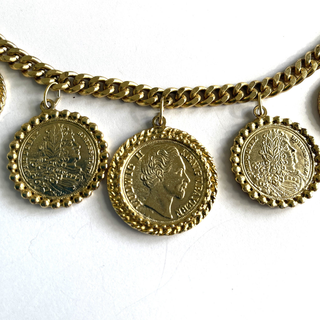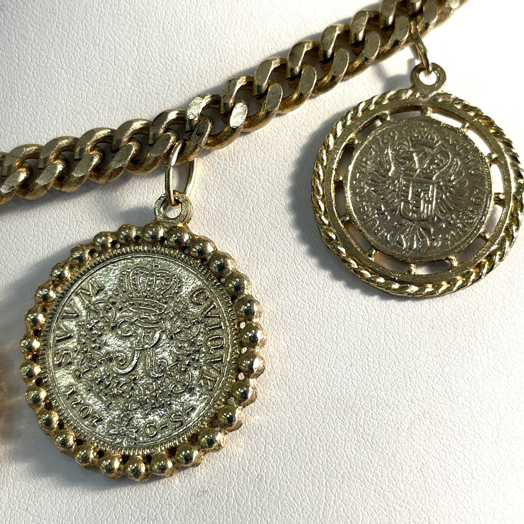 The 1980's was all about bold and beautiful chunky costume jewellery. Lots of chunky gold chains, large pendants and earrings....all contributing to bold fashion statements. This 1980's coin necklace is such an example of the time. Located in old factory stock in London, it has never been worn. There are five coin shaped discs which reflect a Bavarian influence. Each side of every coin is different The metal is gold plated....of medium weight and easy to wear. Size of the coins vary from the large one in the centre at 3cms across, to the smaller end ones at 2cms. Length of the chain end to end is 49cms ending with a hook clasp. Perfect condition. A gorgeous stylish accessory. Gift boxed by Vintageonline.