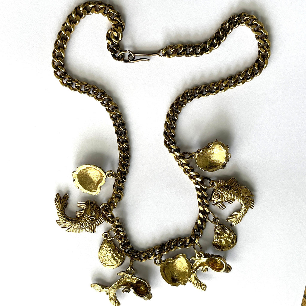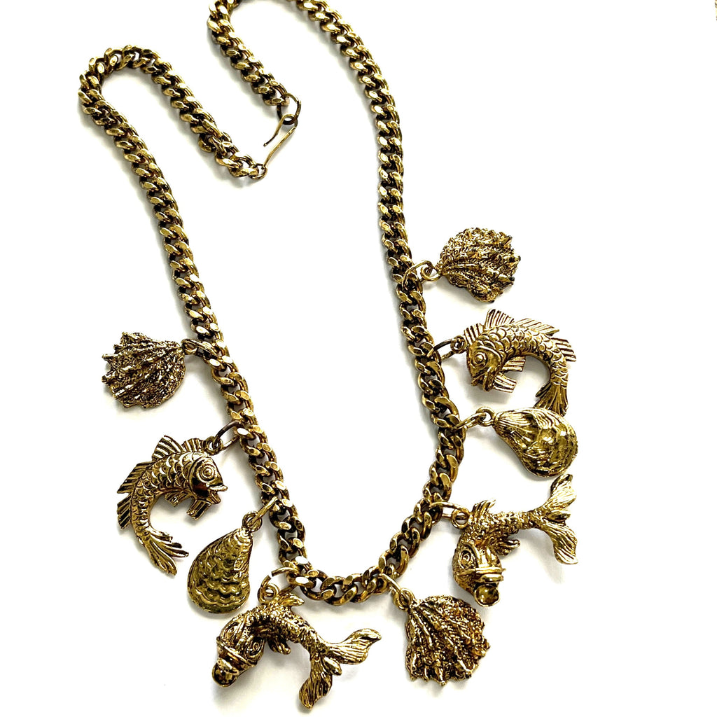 From a factory warehouse in London which was closed down in the 1980's and re opened a short time ago, a statement charm necklace with 9 solid gold tone charms emblematic of the sea with fish and shells. Each charm varies between 2 and 3cms. The solid gold tone chain measures 49cms finished with a firm hook clasp. An iconic 1980's look, in good condition, gift boxed by Vintageonline.