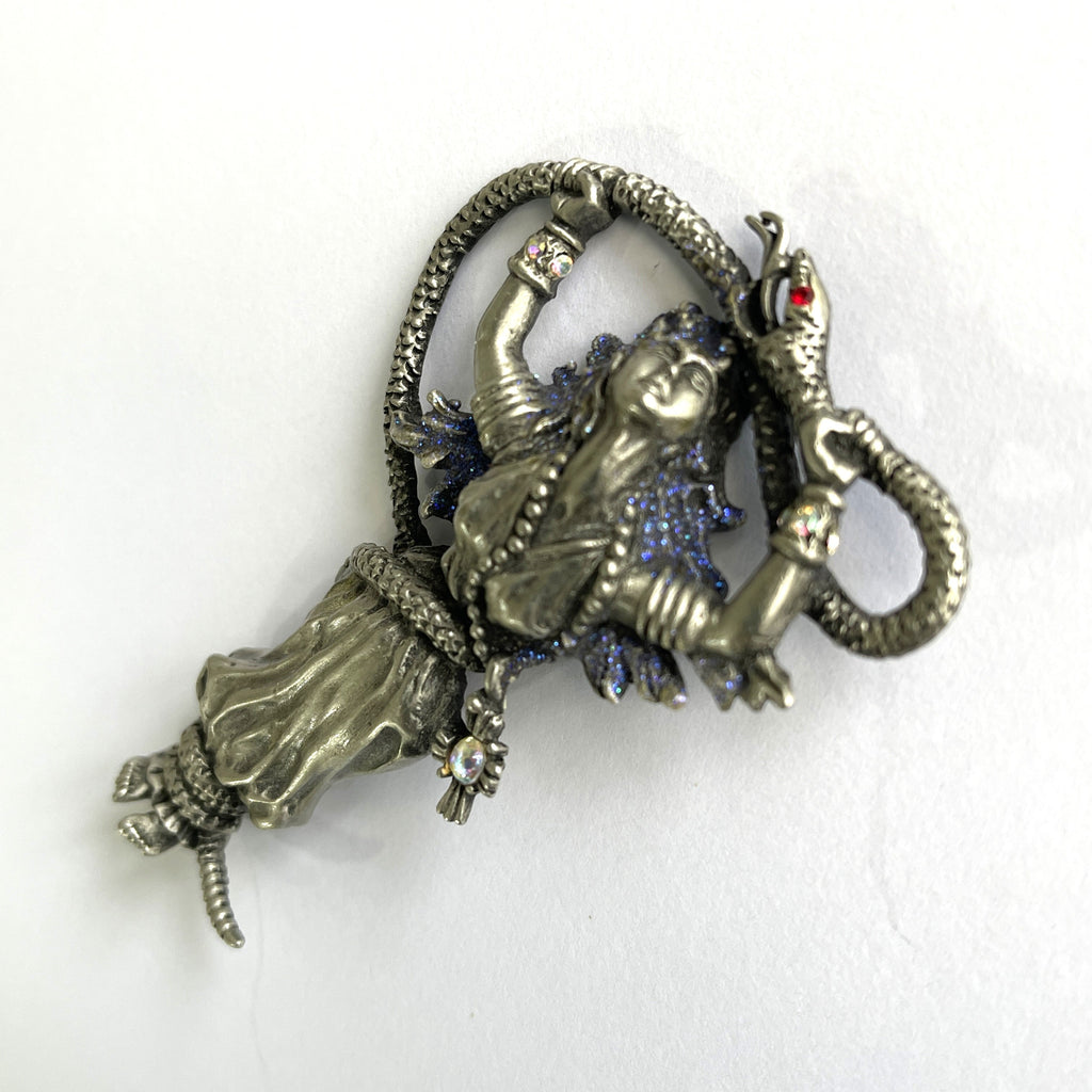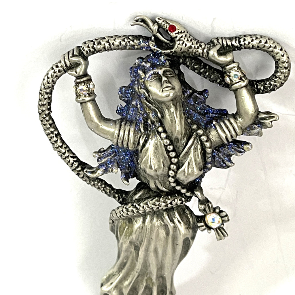 The JJ Jonette Jewellery Company was founded by Abraham Lisker in Providence, USA, in 1935 and started out as the Providence Jewelry Company. It was after WW11 that the name was changed to Jonette Jewelry. During the 1980's they produced their Goddess range and here we have the legendary snake haired Medusa. The story went that Medusa was punished for her misdemeanors by having her hair turned in to snakes. (She had been up to no good in the Temple of Athena with Poseidon !) It makes for a very dramatic story and here we have her made from brushed silver finished pewter. She has rhinestone cuffs, blue rhinestone hair, and the larger snake head above her has a red rhinestone eye. Quite substantial in size at 8.5 x 5cms. At the back we have the Jonette signature and a firm roll over safety clasp. The Jonette Jewelry Company closed in 2006. Gift boxed by Vintageonline.