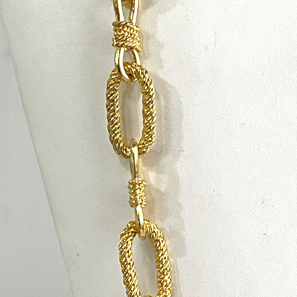 From a whare house in UK closed since the 1980's and new to the market. A long textured gold tone strand, versatile to be worn either as a long strand, or as a double choker style. Measuring 68cms end to end finished with a firm lobster clasp. In perfect new condition, gift boxed by Vintageonline.
