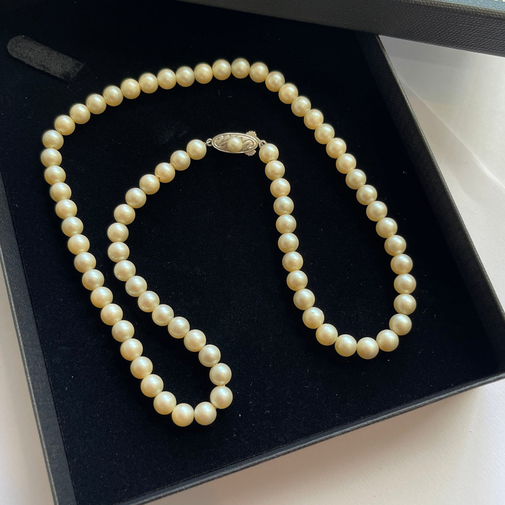 Such a traditional 1960's look, a single strand of faux pearls measuring 45cms end to end to fit most necks, finished with a sweet silver tone push in clasp embellished with a faux pearl. The pearls are all the same size, a creamy white shade, and in very good condition. Ready to look beautiful with any outfit from casual to formal. Gift boxed by Vintageonline.