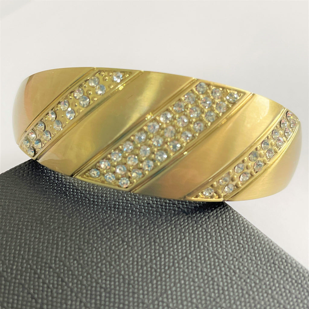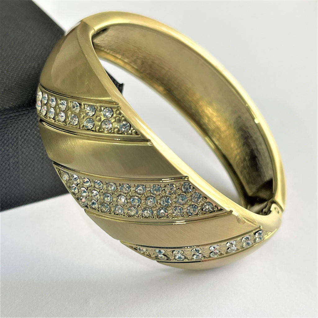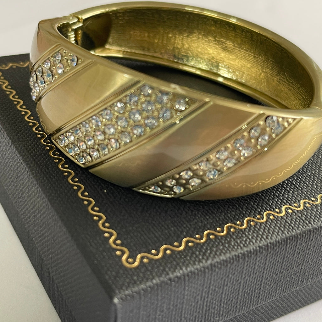 Gold tone bangle set with clear rhinestones. Width of the bangle at widest point is 2.5cms and width across opening is 6cms. Easy to wear with hinge one side and firm push in clasp at the other side. In good condition, a lovely gift, and gift boxed by Vintageonline.