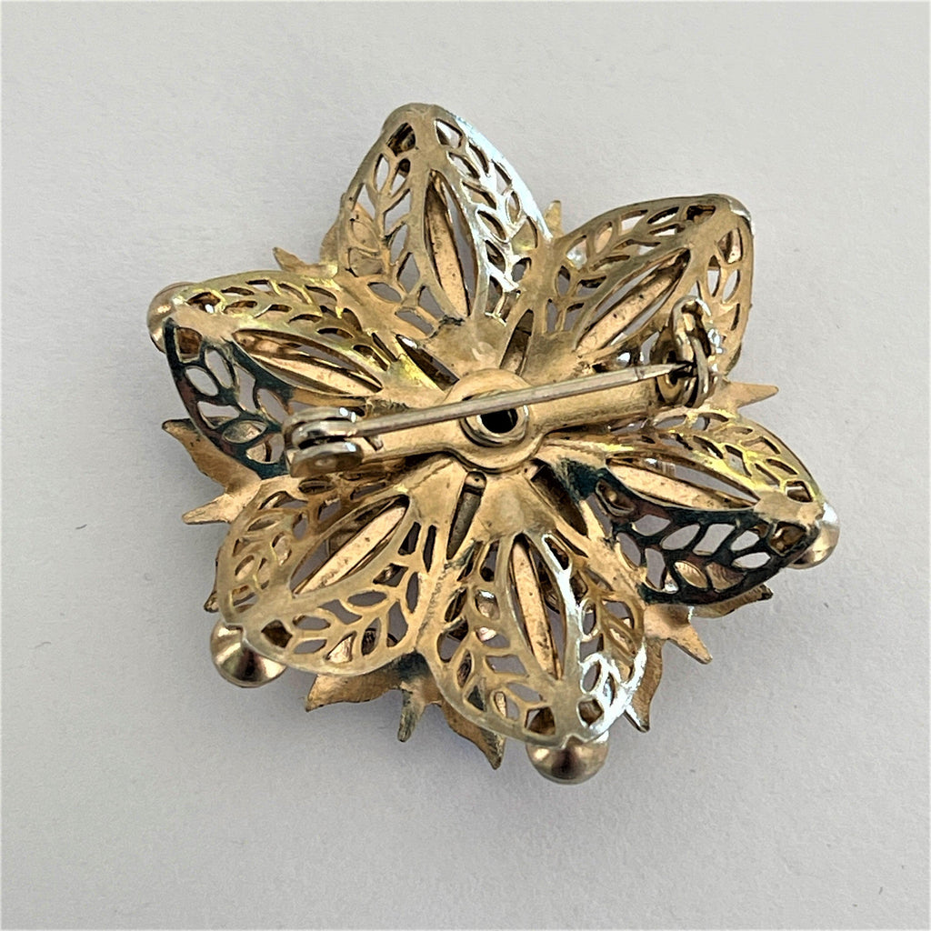 Solid gold tone filigree set with amethyst coloured rhinestones - a pretty wear with any outfit brooch measuring 3.5cms across. In excellent condition - some light reflection in the photographs. A strong roll over safety clasp to the back. Gift boxed by Vintageonline.