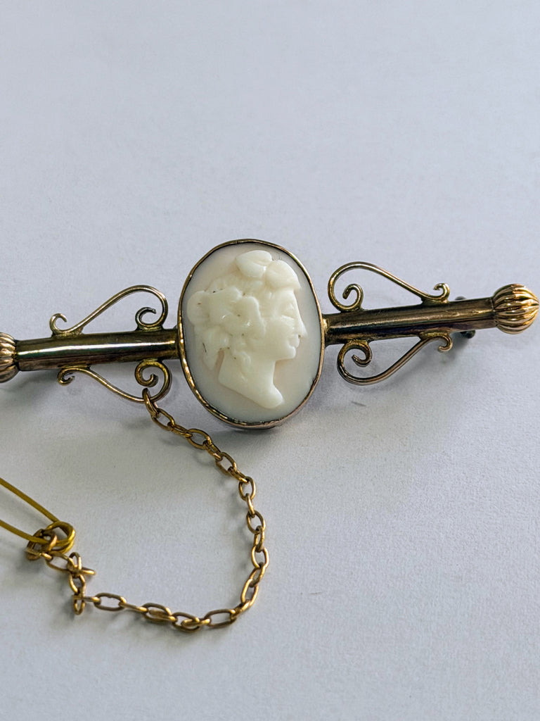 A sweet antique bar brooch with a traditional cameo head and filigree either side. Measuring 5cms across with attached safety pin for added security. Measurement of the cameo head is 2cm x 1cm. The cameo face appears to be an early resin or stone rather than shell. Some times that is hard to tell exactly. There is 9ct gold mark to the back along with a firm C shaped clasp. The long pin may have been replaced at some stage, along with the security safety pin. For the olde world antique lover, the brooch is in good condition with wear commensurate with its 100 year age, and gift boxed by Vintageonline.