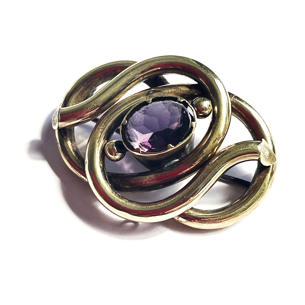Few things are as romantic as the 1800's, beginning with the romance of Queen Victoria and Albert. Queen Victoria was particularly fond of the snake emblem, and her engagement ring was in that shape. Jewellery manufacturers had to keep up with demand from the women who wanted to share in the romantic Victorian look. The lovers knot brooches became very popular during the later half of the 1800's and this is a lovely example with a central prong set amethyst paste stone centred in the snake like shape of gold lined metal often referred to as pinchbeck, or gold lined. Overall dimension is 4cms x 3cms with a firm C shaped clasp to the back. Now around 140 years old, it is in very good pre loved condition, gift boxed by Vintageonline.