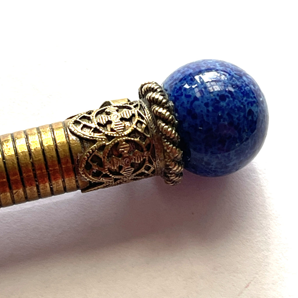 1930's bar brooch , a ridged gold tone bar with filigree either end, along with a ball of lapis lazuli. Width of the bar is 1cm with the lapis bar measuring 1.5cms across. Length of the brooch from one end to the other is 8cms finished with a firm C shaped clasp to the back. In good condition, gift boxed by Vintageonline.