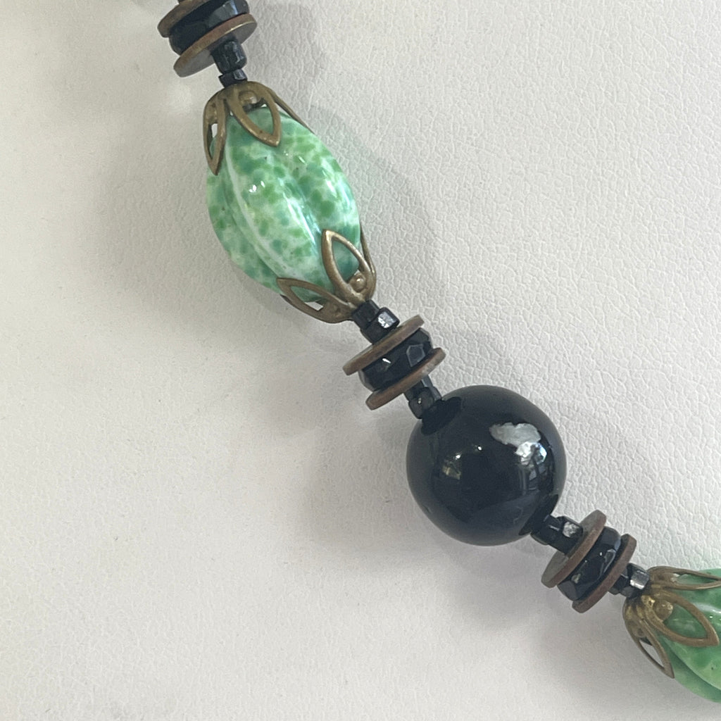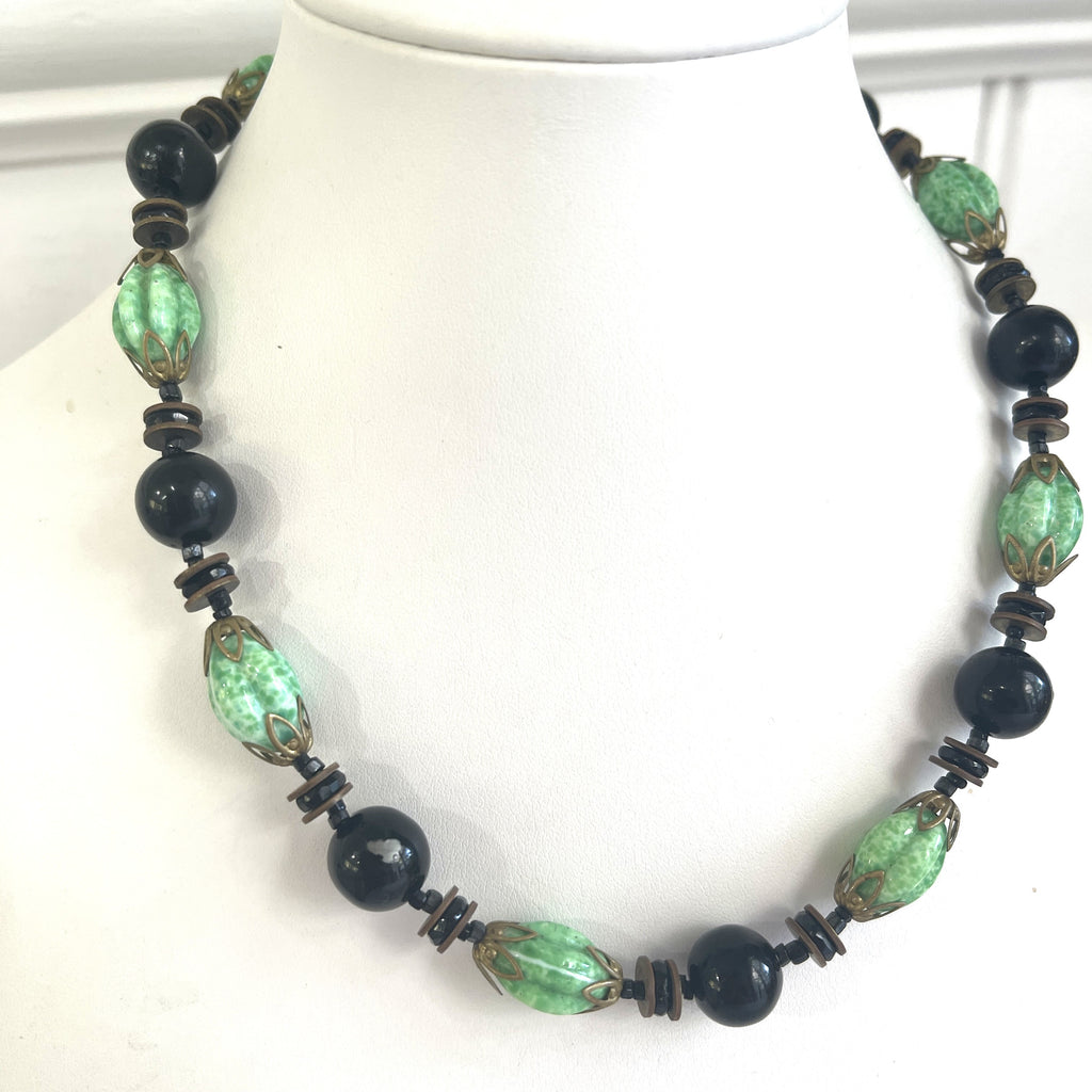 Green ridged elongated glass beads capped with brass caps either end, combined with round glossy black beads each interspersed with black and brass rondelle beads. A lovely vintage look with a measurement end to end of 41cms. Necks were smaller at that time, so just in case it is required to be a little longer, we will send along a 10cm extension gold tone extension chain. Even if it fits as a choker style, it does give you the option of wearing it a little lower. The extension will sit at the back, and not be seen. In very good pre loved condition the necklace is finished with a brass tone ring clasp. Gift boxed by Vintageonline.