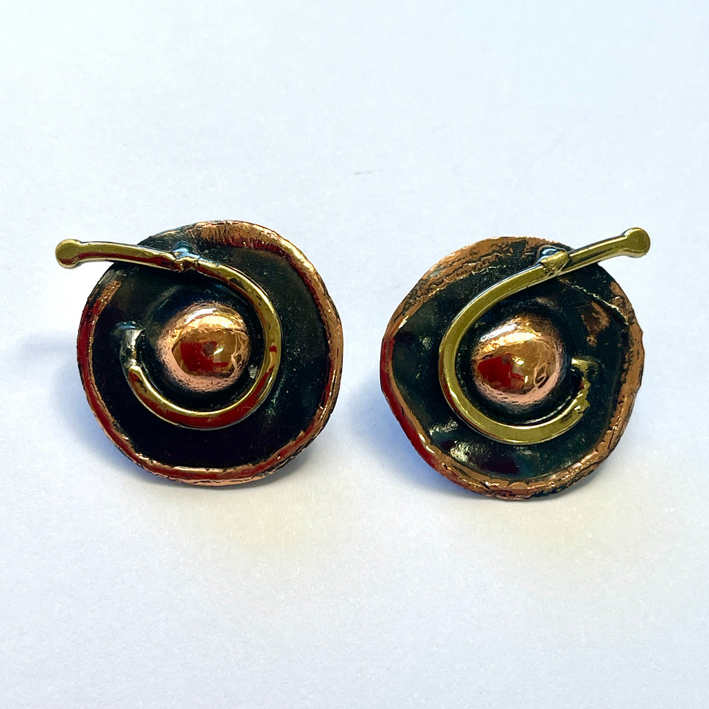 Purchased at the Renee Taylor Gallery, Sedona Arizona, USA. A unique design in copper, these clip on earrings are in excellent pre loved condition and comfortable to wear.  Dimension across is 3cms. Hand made from copper and gift boxed by Vintageonline.