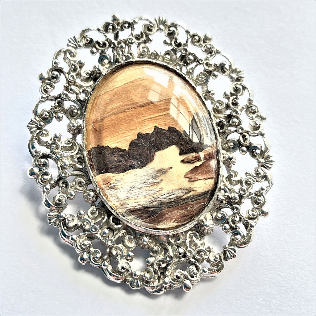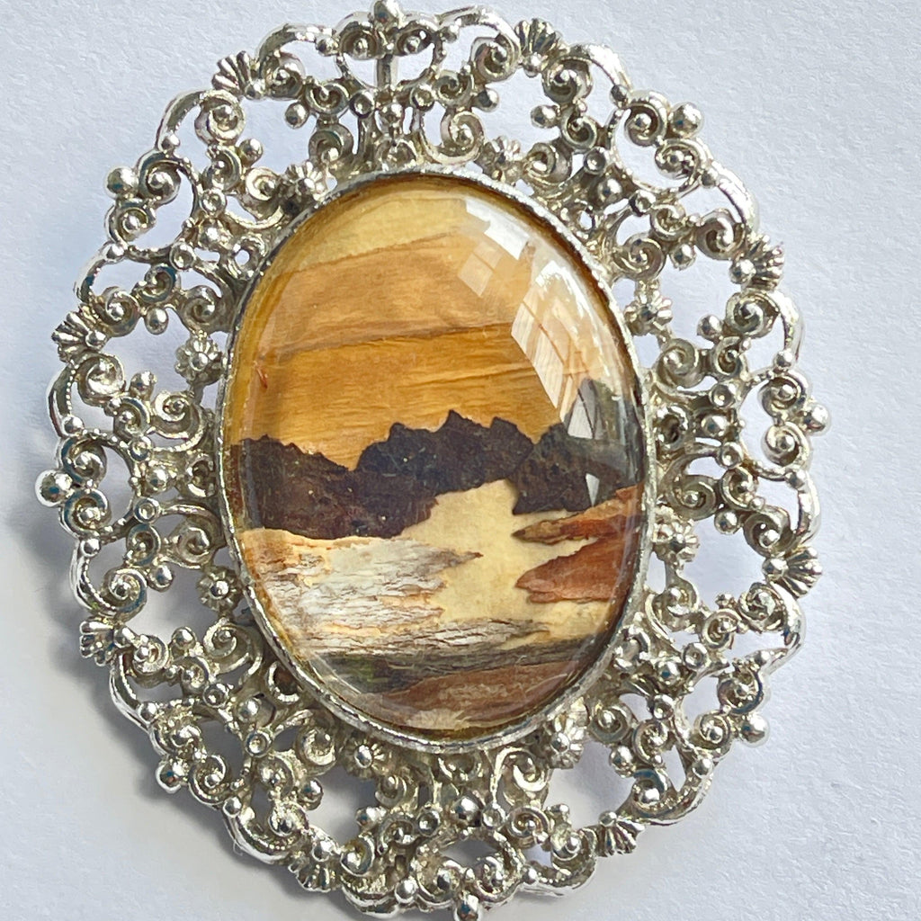 Painting cleverly applied to bark make this an interesting centrepiece to the frame of silver tone filigree. There is a roll over safety clasp to the back along with a pendant bale so that it can be worn also around the neck. Quite large at 7cms x 6cms. In very good condition and gift boxed by Vintageonline.