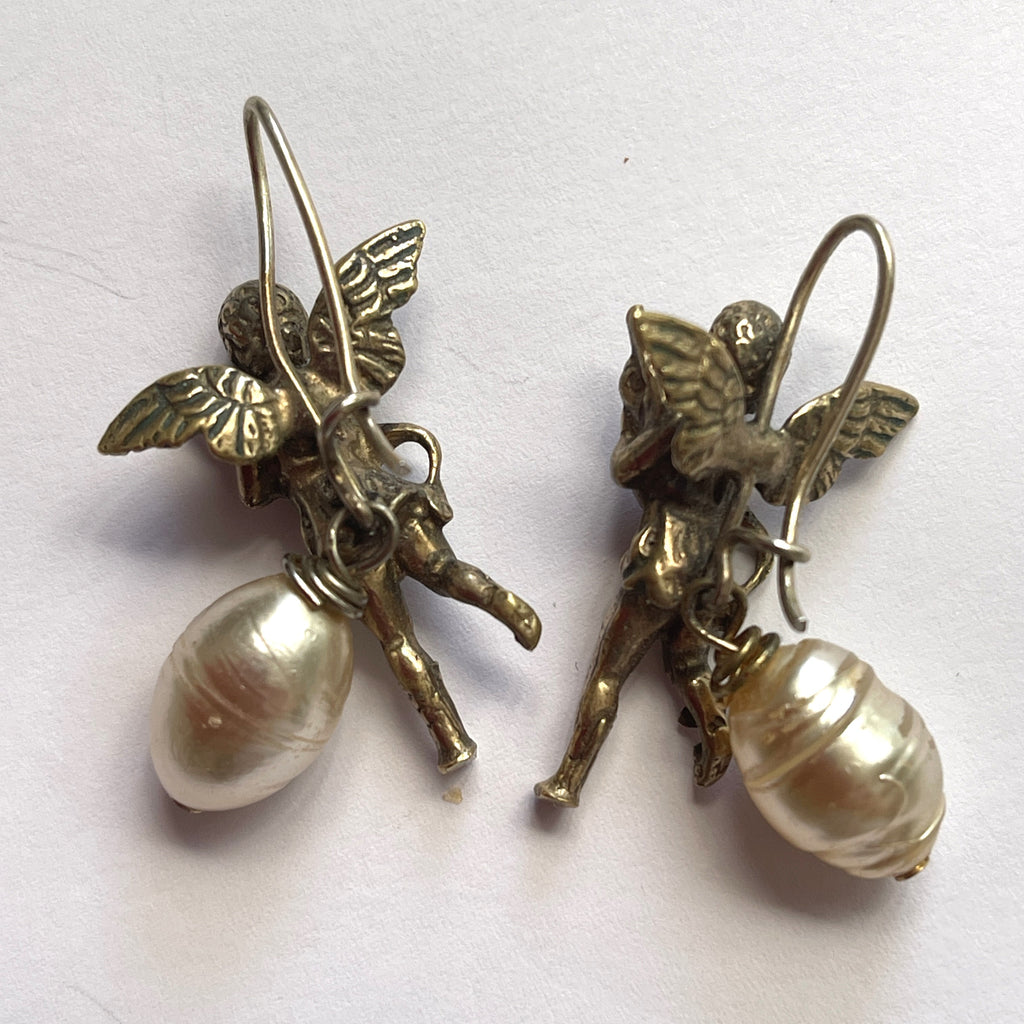 The sweetest earrings with an angel or putti holding an arrow in gilt metal with a baroque pearl drop. They are for pierced ears with a wire and hold mechanism. European in design but not signed. Nice quality. Length of the earrings is 3.5cms and width across his wings is 2cms. In very good condition, likely dated to the 1990's - early 2000's I would think. From an estate sale - perfect for your love, gift boxed by Vintageonline.