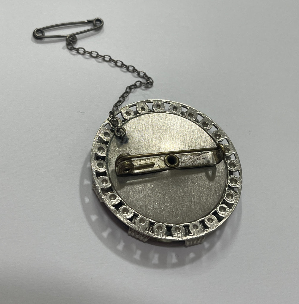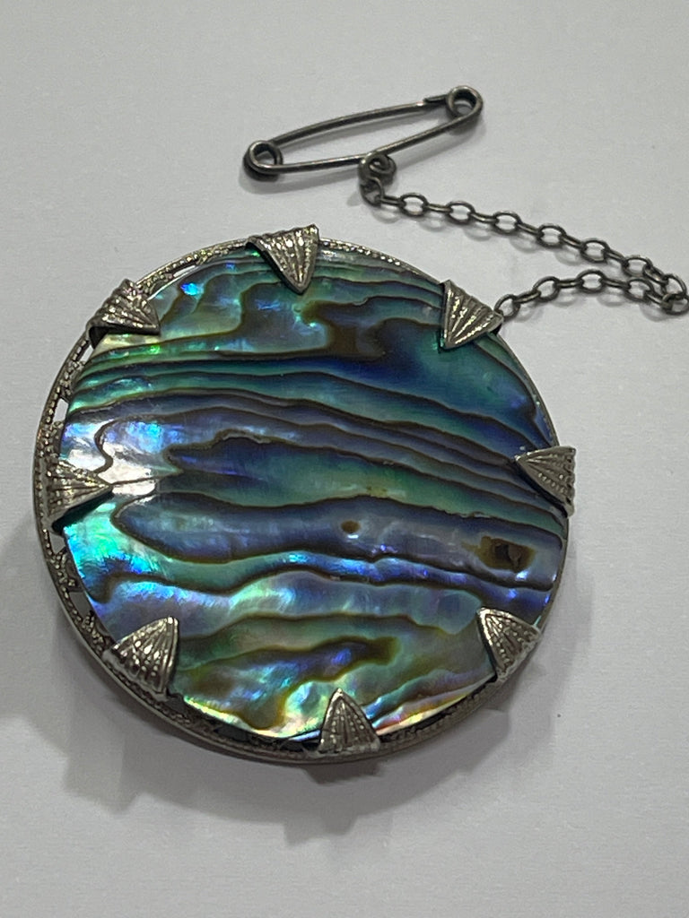 Paua shell is so beautiful as it shines in the light reflecting blues, greens, purples. I would think this lovely vintage brooch is from New Zealand. Paua Shell brooches have often been brought back as souveniers over the past 60 - 70 years. It is a round disc measuring almost 4cms across, set in silver tone metal with etched silver tone holding clips. A firm workable C shaped clip to the back. There is also the addition of a safety chain. All indicating a brooch from at least the 1960's period. In very good condition, gift boxed by Vintageonline.