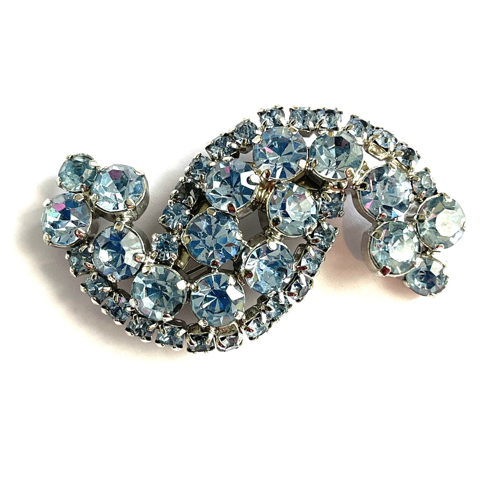 A freeform shape with faceted and prong set beautiful blue rhinestones set in silver tone metal with a firm fold over safety clasp. Dimension is 7cms x 3.5cms. Beautiful reflective , cornflower blue rhinestones. From estate sale USA, in excellent condition, gift boxed by Vintageonline.
