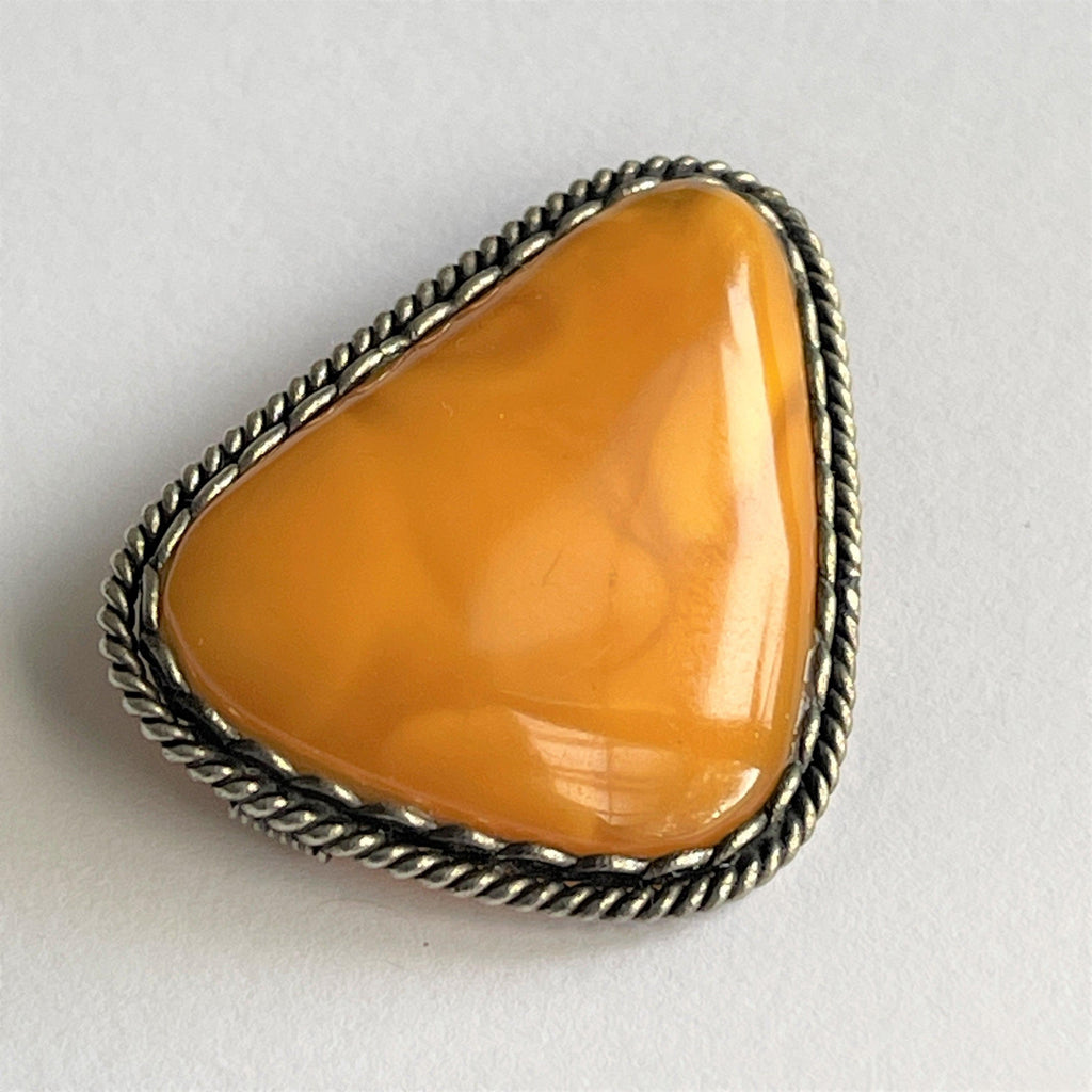 Hand made using Baltic amber and set in rope edge silver tone metal. Amber is a fossilised resin which resembles a gemstone although warm to the touch. From an estate sale in USA. Overall dimension is 3cms on each side of the triangular shape. In perfect condition w3ith silver tone C clasp to the back. Tested positively for amber. Gift boxed by Vintageonline.