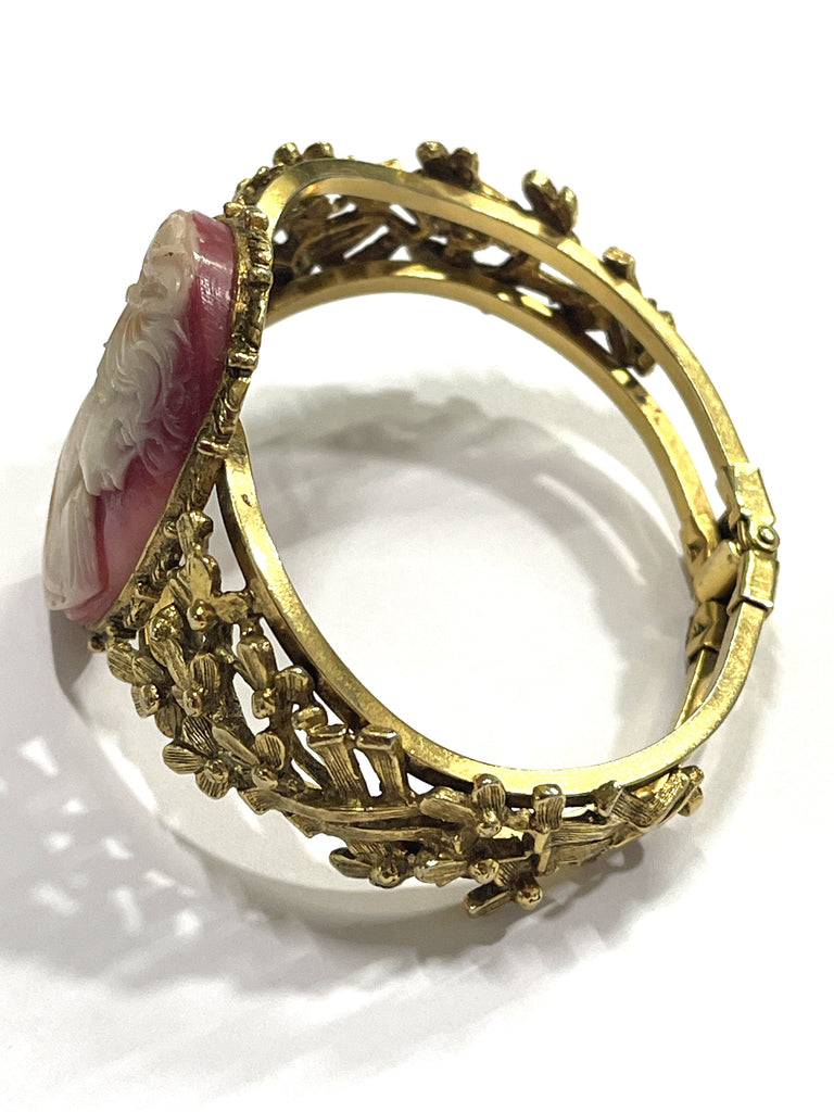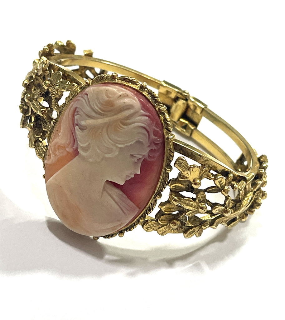 Beautiful cameos have been around for hundreds of years and the original technique was painstakingly slow as stone and shell were individually carved. During the middle of the 20th century plastic became available to emulate the stone and shell, and also make the beautiful cameos accessible to every one. So the resin cameo was born. The filigree metal on this clamper bracelet is beautiful with gold tone flower heads, very much in the traditional antique style. The resin cameo is large in size at 4cns x 3cms set in to a gold tone filigree frame. So the bangle has every inch the look of an antique piece but it is actually from a later period. It is in very good condition, a recent acquisition from an estate sale USA Width across is 6.5cms so not for a large wrist. Gift boxed by Vintageonline.