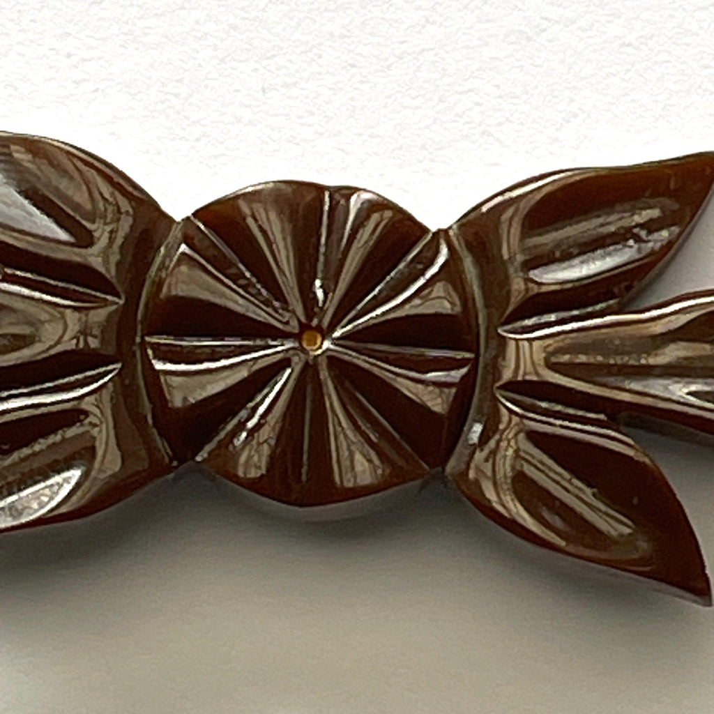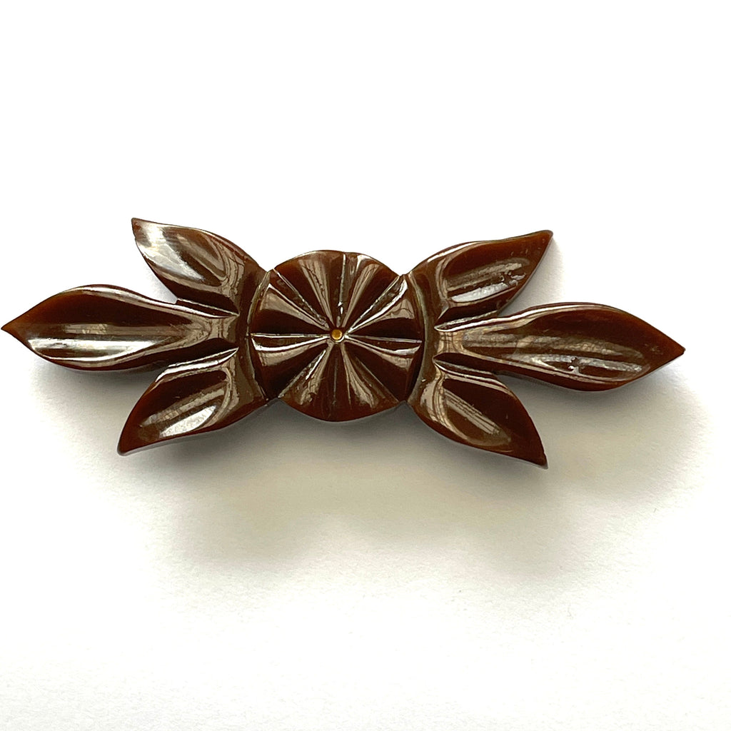Looking very much like bakelite but not testing as such, a vintage acrylic brooch with a centrepiece flower head and leaves. Measurement is 8.5cms x 3cms. In very good condition with a firm roll over safety clasp to the back. Gift boxed by Vintageonline.