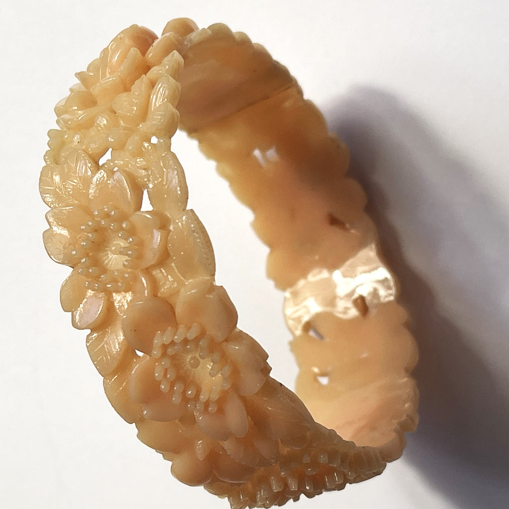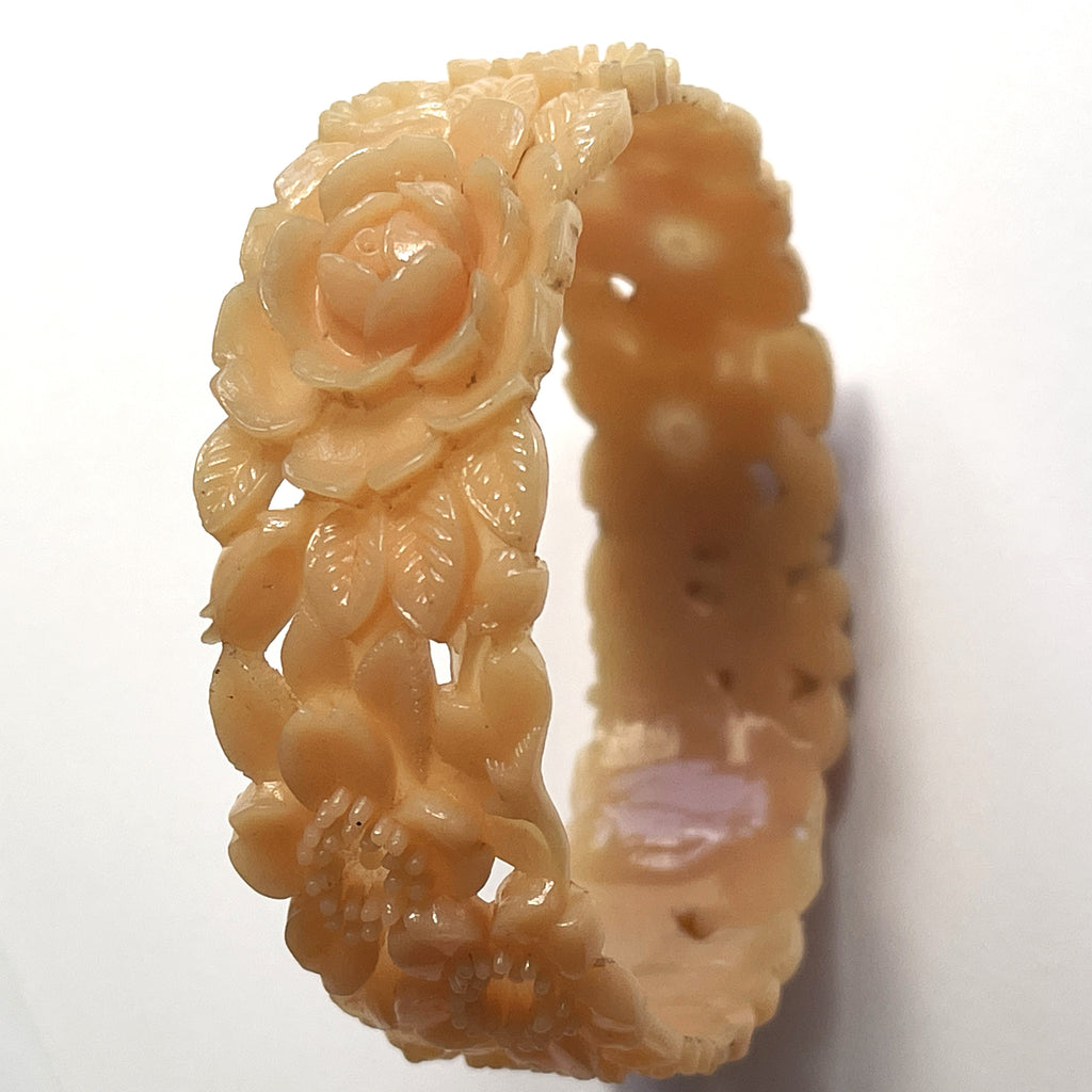 Celluloid has a long history as an early plastic and it was put to good use during the middle of the last century to make inexpensive light and easy to wear costume jewellery. This is a sweet celluloid bangle with carved roses and daisies and leaves. It is a pale apricot colour and measures 7cms across. Perfectly round to slip on to the wrist, and not for large wrists. A pretty addition to the collection of a mid century lover. Gift boxed by Vintageonline.