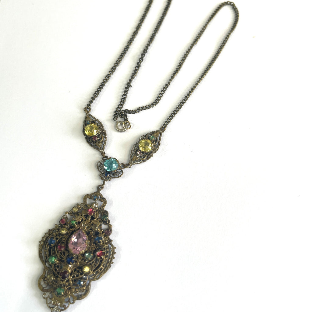 Typically Czech with filigree set with a central pink crystal stone fully faceted surrounded with a rainbow of smaller crystals. The pendant hangs from a three section drop each also centred with faceted stones. Length of the brass tone chain is 50cms finished with a newer firm ring clasp which has been added at some point. Size of the pendant part is 5cm x 3cm. in good vintage condition, gift boxed by Vintageonline.