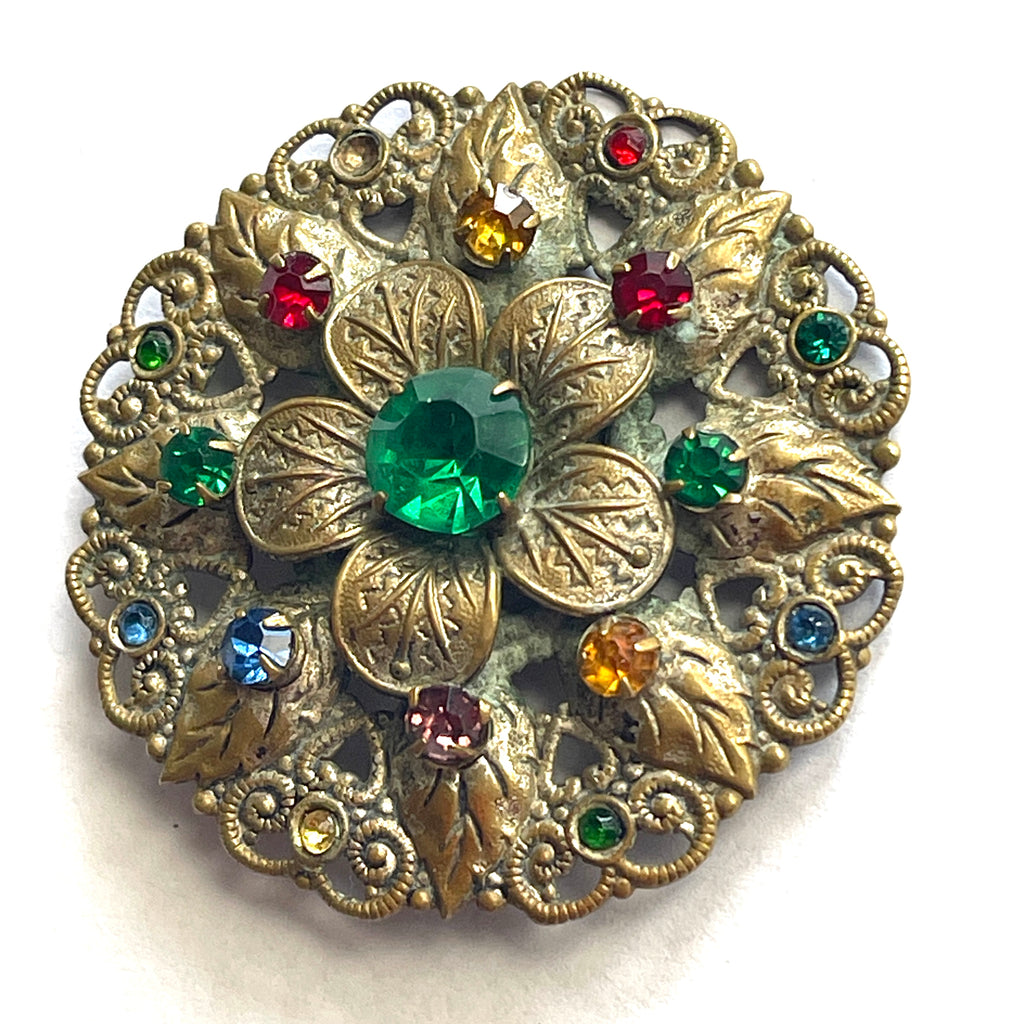 Czechoslovakia was a large producer of beautiful costume jewellery prior to the second world war, and these wonderful filigree brooches are typical of the time. Here we have a brass tone filigree brooch with a central flower emblem with fully faceted green stone flanked by metal petals. The rest surrounded by coloured stones. Overall dimension is 4.5cms across finished with a firm C shaped clasp. In excellent pre loved condition in delightful design, gift boxed by Vintageonline.