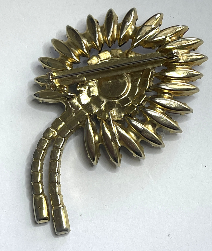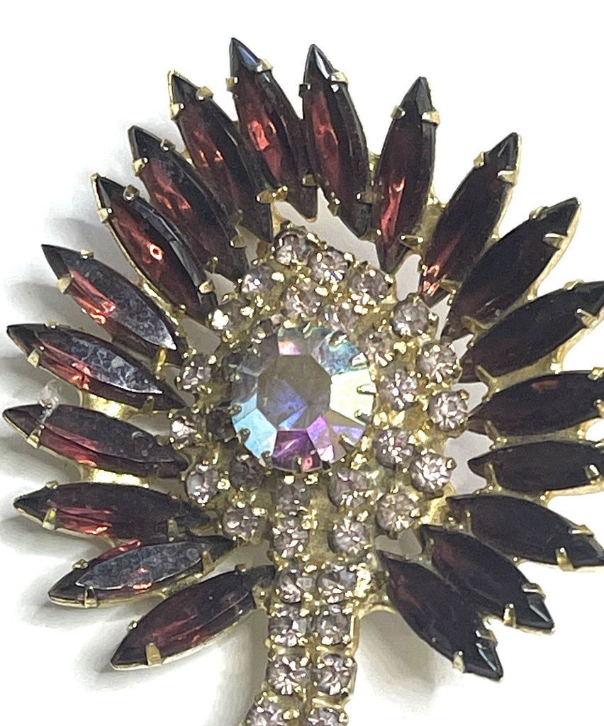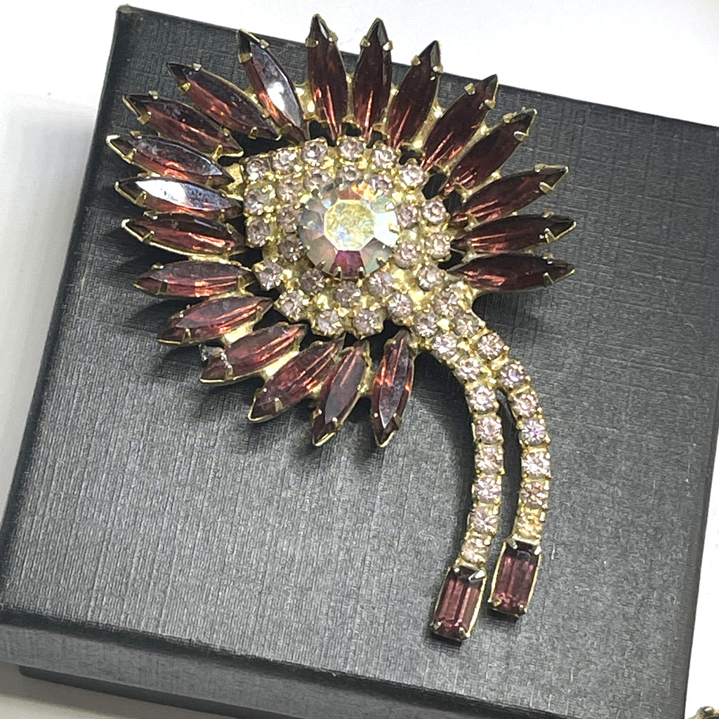A recent acquisition from an estate sale USA. Free form flower shape with a large central aurora borealis rhinestone reflecting a rainbow of colours. The large central stone is surrounded with small clear rhinestones and a fringe of tear drop shaped deep purple rhinestones each one prong set and fully faceted. The "Stem is a double row of rhinestones finished with baguette shaped deep purple rhinestones. All in perfect condition, set in gold tone metal with a firm roll over safety clasp to the back. Overall dimension is a length of 7cms and 5cms across the flower head. All of the rhinestones are shiny and bright. Gift boxed by Vintageonline.