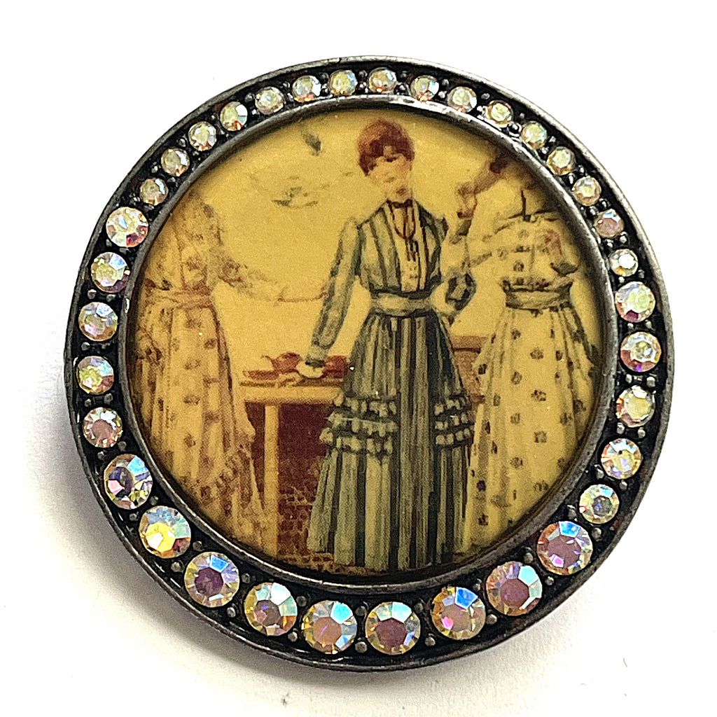 A recent arrival from an estate sale UK, possible 1960's - could be later. In very good condition with an Edwardian dressed lady in her dressing room. The picture is encircled with rhinestones with aurora borealis finish to catch the light. Size across is 4cms. Gift boxed by Vintageonline.