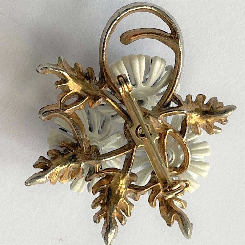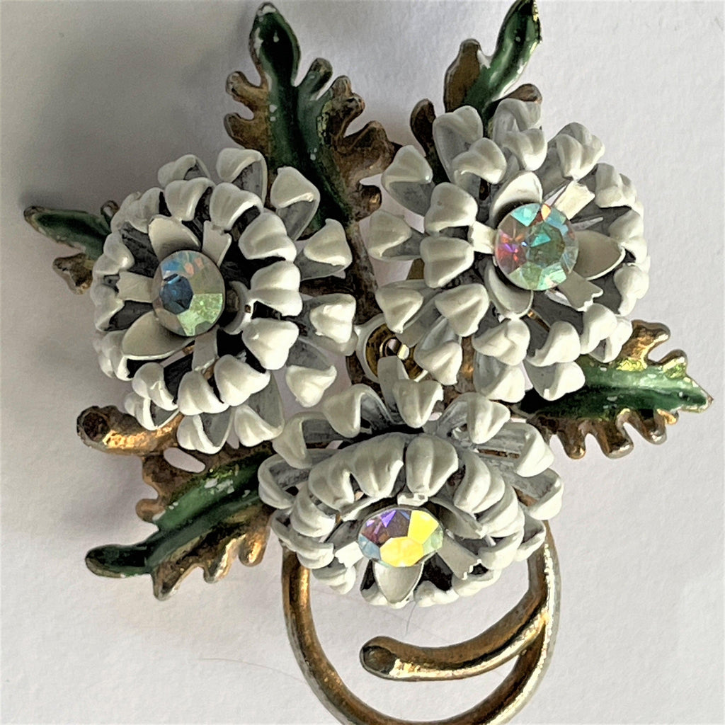 A very pretty enamelled floral brooch with three flower heads in white enamelling each centred with a rhinestone finished with aurora borealis to catch the light. Green and gold enamelled leaves surround. Overall dimension is 6cms across. There is a firm roll over safety clasp to the back. In very good condition, gift boxed by Vintageonline.