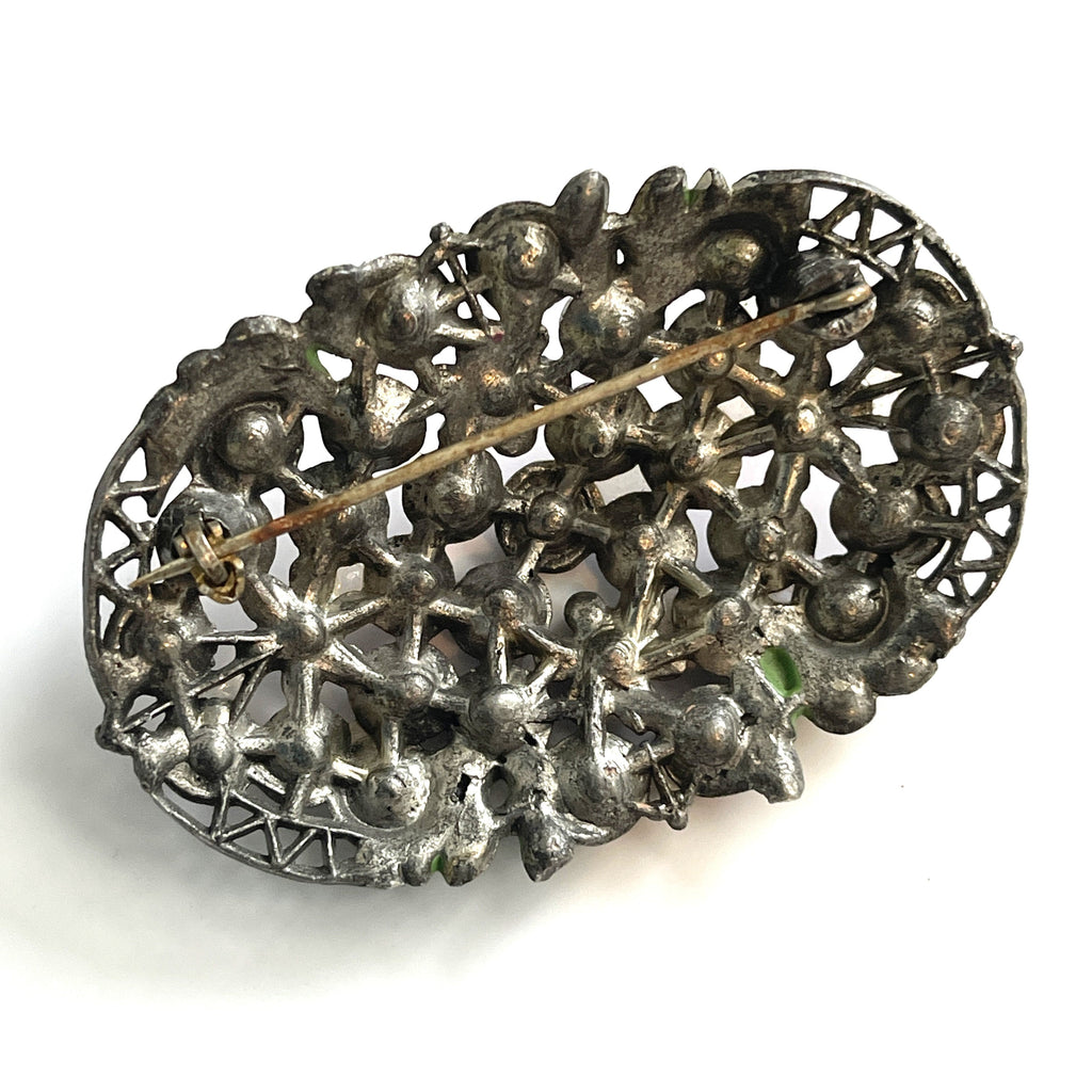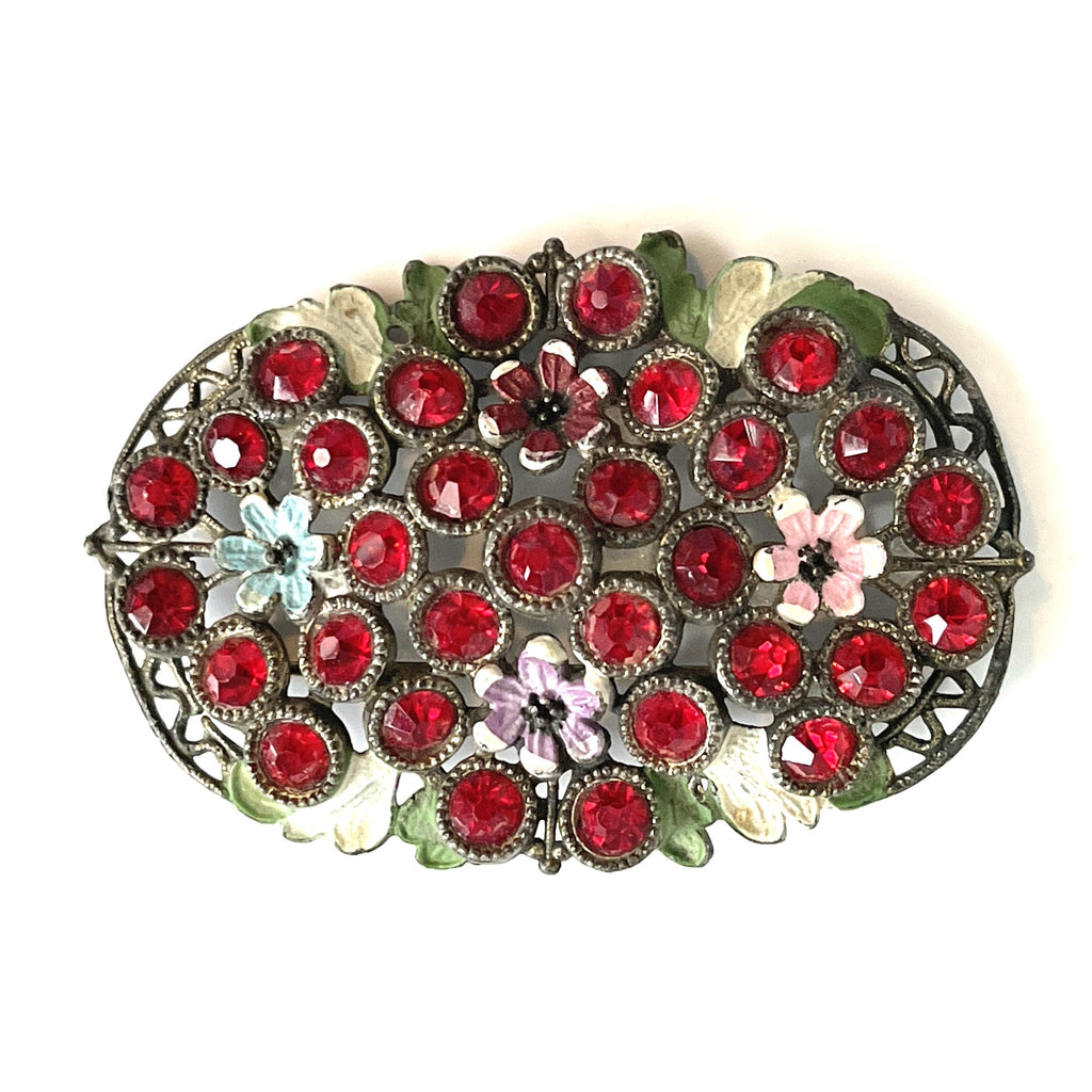 From an estate sale USA, a charming vintage brooch with hand enamelled flowers and leaves and vibrant red rhinestones. Set in cast metal there is a firm roll over safety clasp to the back. Overall dimension is 6cmx 4cms. In very good vintage condition - a charming addition to any outfit. Gift boxed by Vintageonline.