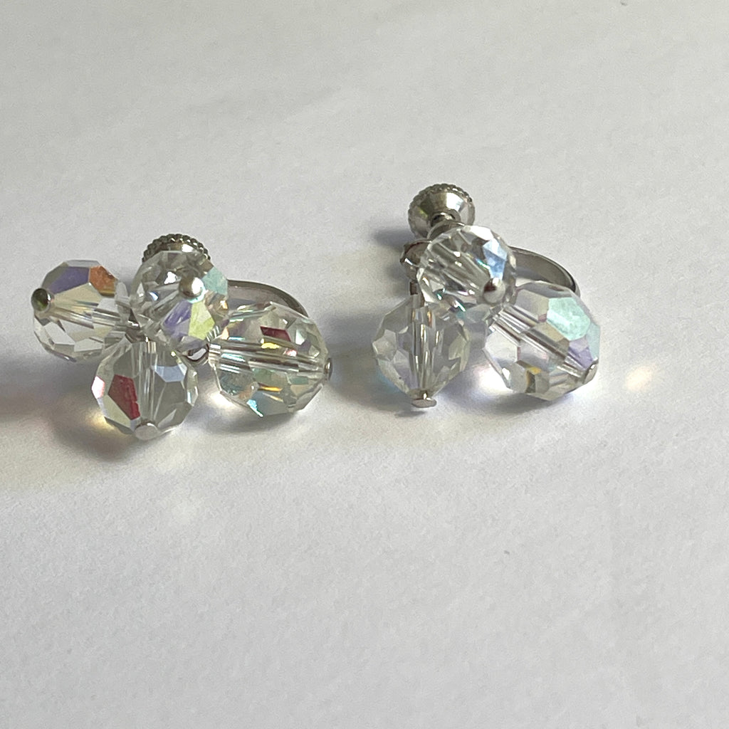 Nothing says mid century more than crystal beads...and this is a lovely example...two strands of faceted real crystal beads with aurora borealis finish to catch the light., each one wired to the next finished with crystal extension chain and hook. Total length end to end is 39cms, suitable for small to average neck size. The matching earrings are screw on, firm and comfortable each with three matching crystal beads set in silver tone metal. This is a lovely vintage set in excellent condition, gift boxed by Vintageonline.