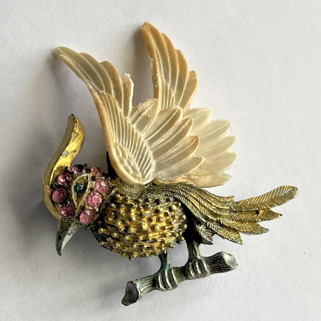 Perhaps a cockatoo showing off his magnificent wings ? A cute resin mid century brooch depicting a bird on a branch. It is from an estate sale with no provenance...he looks to be hand painted, and has a cute face embellished with tiny pink rhinestones. He is dominated by his show off sculptured resin wings. Overall dimension is 4cms x 5cms. A firm roll over safety clasp to the back. He is cute, with wear to his back synonymous with his 60 plus years of age.
