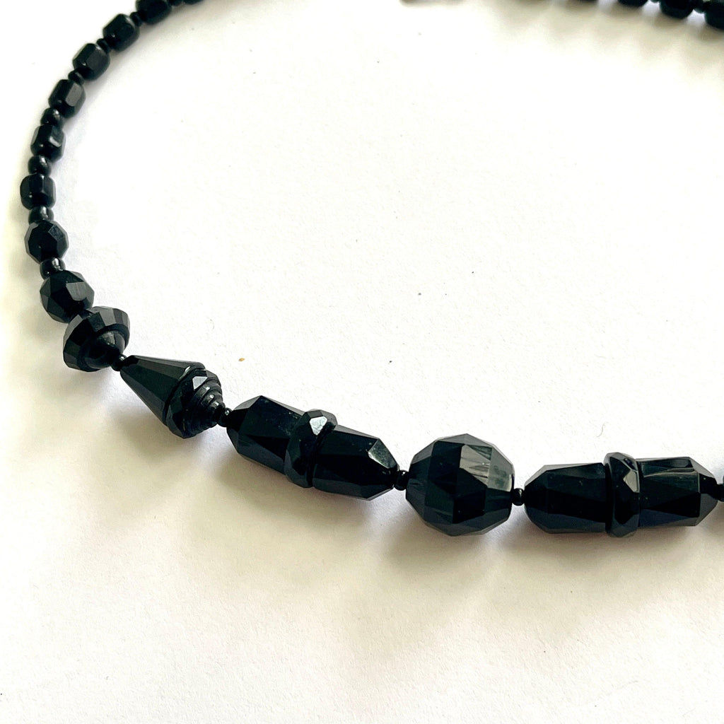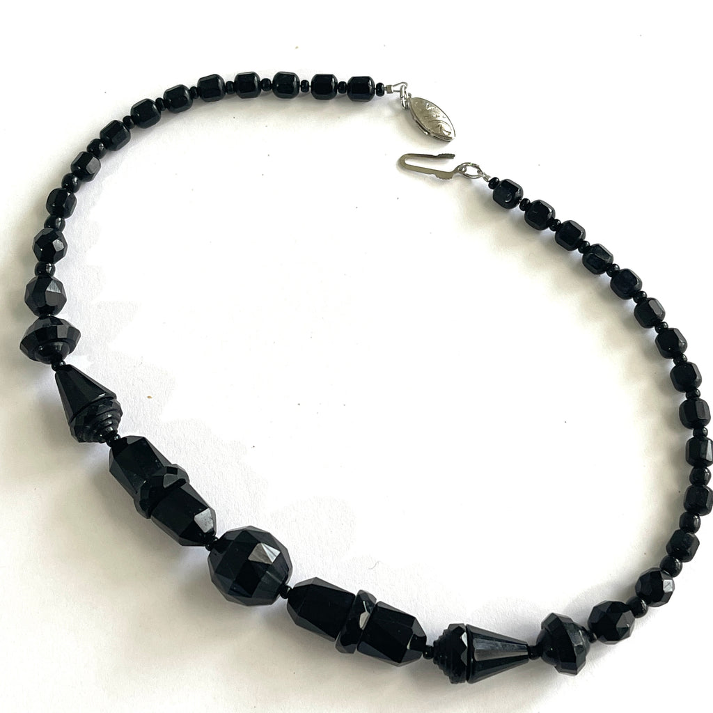 Beautiful jet black glass beads in a variety of art deco shapes measuring 39cms, so not a long necklace, sits at the throat finished with a silver tone vintage push in clasp. All in excellent condition. The larger centrepiece of beads each measure 1cm across. A timeless accessory to compliment any outfit. Gift boxed by Vintageonline.