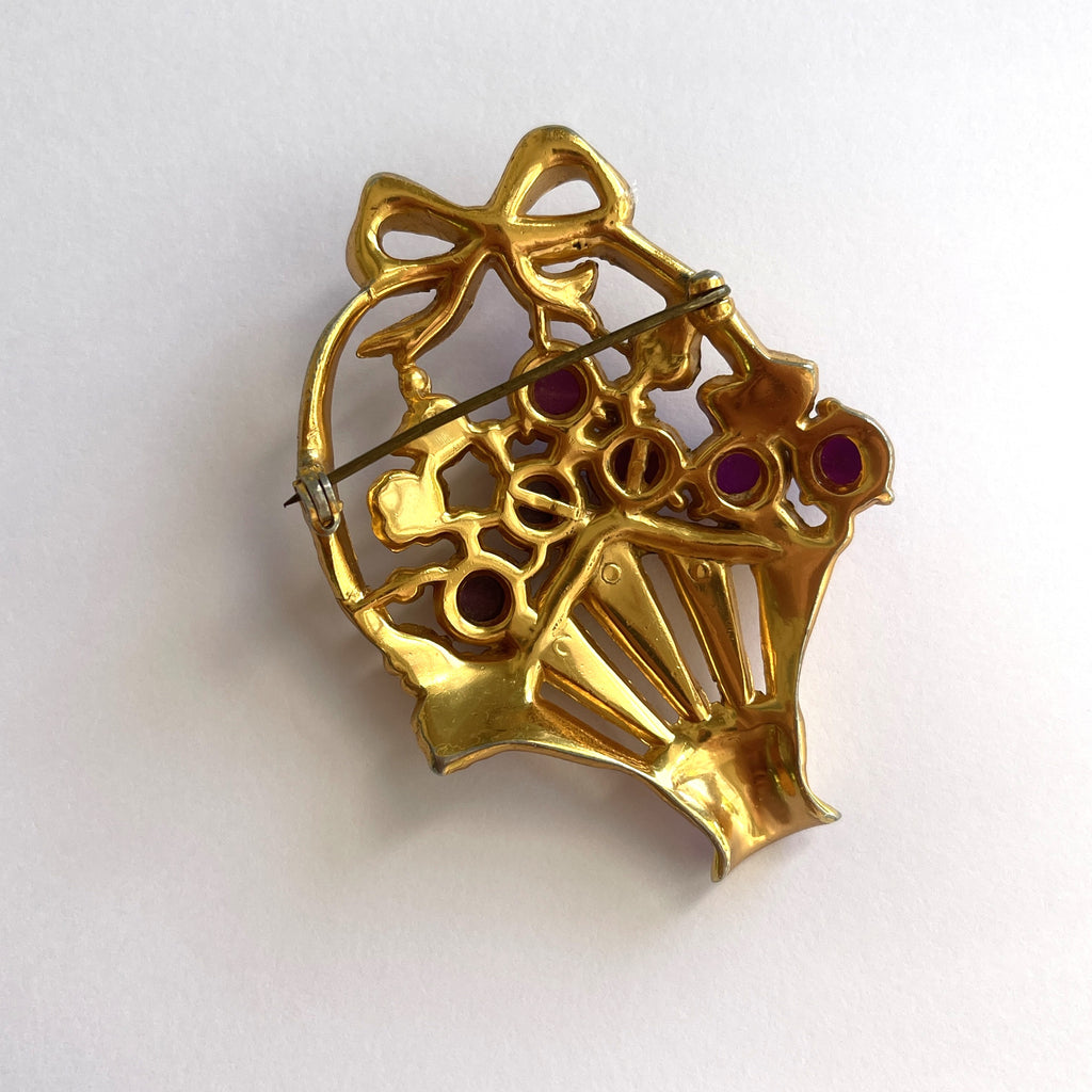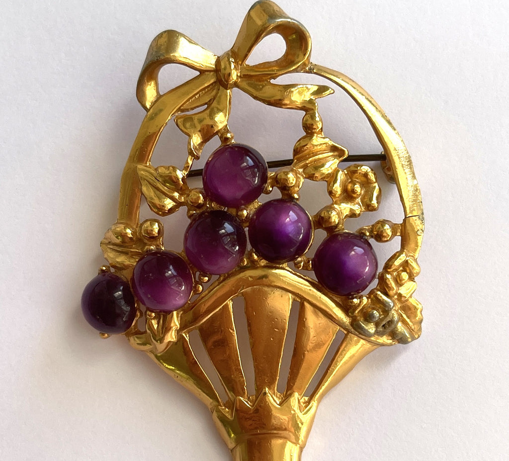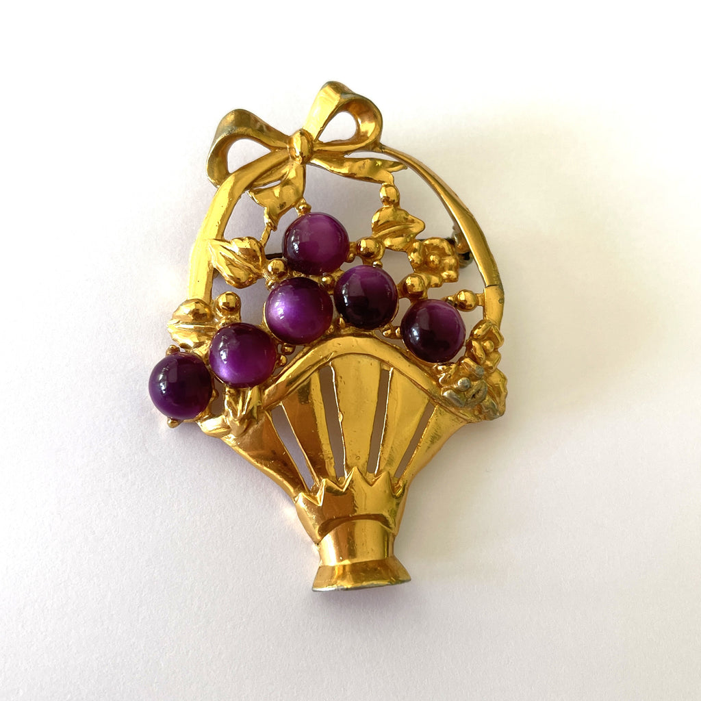 A large brooch in the shape of a basket with purple cabochon stones. It is a quality weighty piece with no signature. Overall measurement is 7cms x 4.5cms. In excellent condition with a firm roll over safety clasp to the back A recent arrival from USA. Gift boxed by Vintageonline.