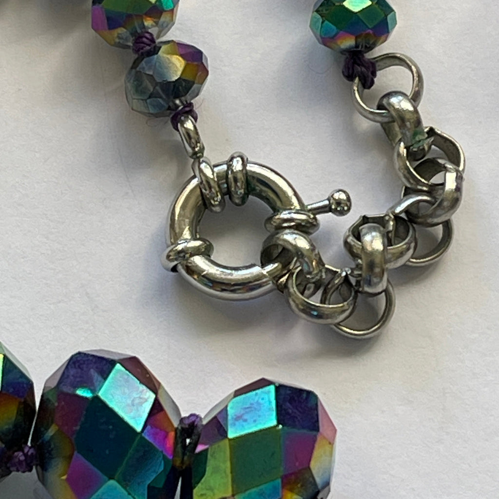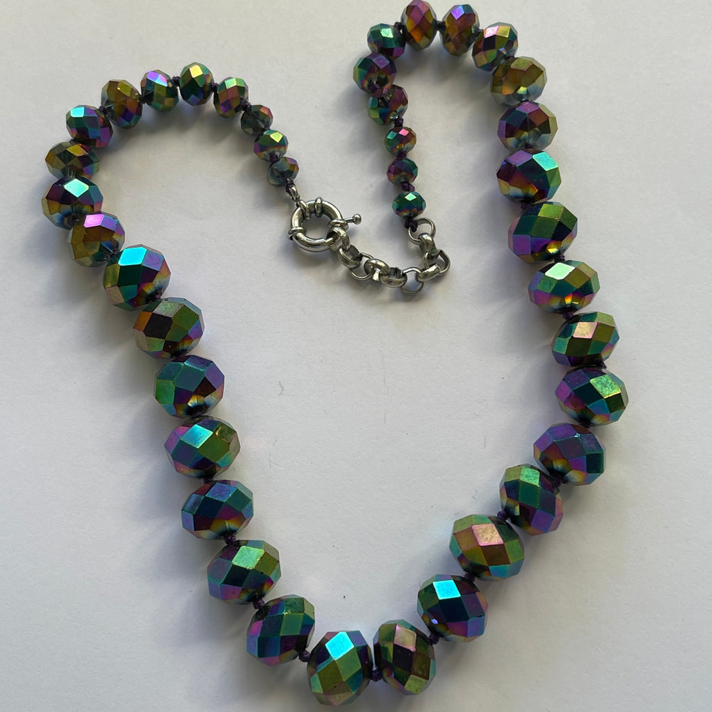 Irridescent rainbow colours of green, purple, gold and pink eminate from these fabulous aurora borealis coated beads. It is a single strand necklace with beads graduating in size from the front central 16cm beads. From an estate sale and I suspect the beads that are older have been re strung, each one separated with a knot, and a silver tone extension and round silver tone lobster catch. Length of the necklace end to end is 50cms., to fit all necks. In very good condition. A wonderful colourful accessory to lift any outfit. Gift boxed by Vintageonline.
