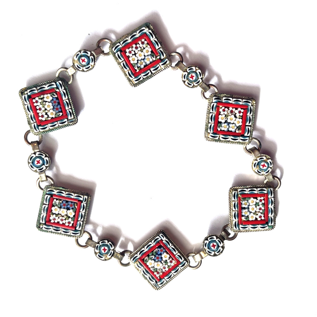 Beautiful micro mosaic set in brass. A nostalgic and special bracelet from the 1940's period hand crafted in Italy. (Marked Italy to the back) The micro mosaic jewellery of Italy was popular first as souvenir jewellery starting from the time of the Grand Tour during the late 18th and early 19th century. Skilled artisans placing each tiny tile in to the setting. Each of the four sided squares measure 1.5cms x 1.5cms. and length of the bracelet end to end is 20cms finished with a firm hook clasp. There is some wear to the inside only of the bracelet whilst the mosaic tiling is still intact and bright. Highly collectable nostalgic piece. Gift boxed by Vintageonline. Free express postage within Australia.