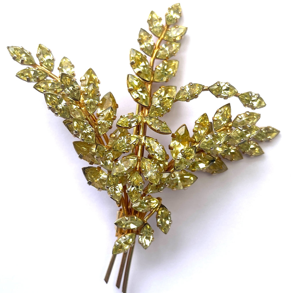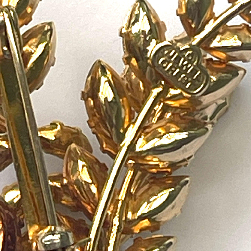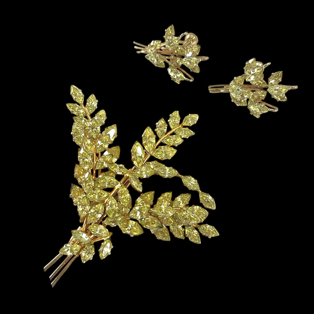 A wonderful find from the prominent Australian Costume Jewellery brand created by designer Donald Simpson operating between 1950's and early 1970's. Highly sought after for the quality and design and use of beautiful Austrian Crystals. The brooch, set in gold tone metal is signed JEWEL CREST, along with a firm roll over safety clasp.The earrings are as usual in a set, unsigned. The earrings are typically screw back. Condition of both the brooch and earrings is immaculate and shows no sign of wear at all. The brooch measures 8cms x 7.5cms. The matching earrings measure 3cms x 2cms. A truly beautiful brooch and earrings, to wear as a set, or separately. Gift boxed by Vintageonline.