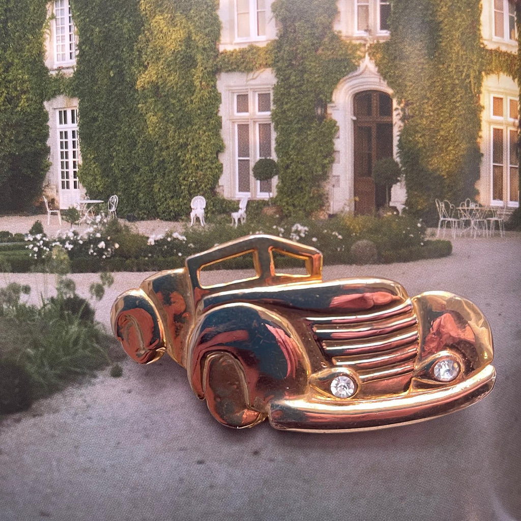 A large brooch at 8cms x 4cms in gold tone metal with clear crystal headlights. There is a firm roll over safety clasp to the back. In good condition, and gift boxed by Vintageonline.