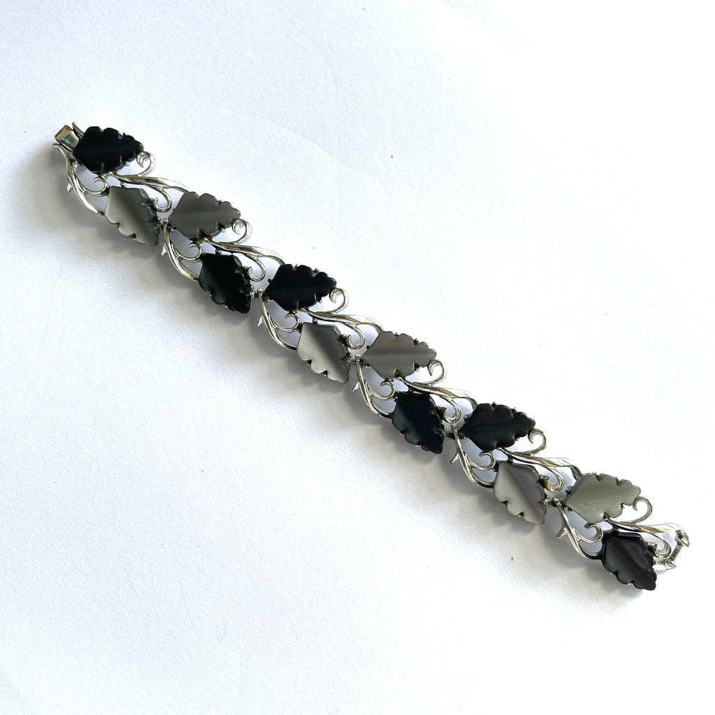 This particular leaf design is attributed to the American Costume Jewellery Company Lisner and bracelets can be found with the Lisner signature, however this lovely example comes unsigned. Now almost 70 years ago so whether this was one of a range that went unmarked or whether it was actually produced by one of the other many American Costume Jewellery companies it is difficult to tell. It is however still in excellent condition with a combination of pearl grey and charcoal grey lucite oak leaves set in shiny silver tone. It has a width of 2cm and length end to end 17cm finished with a firm fold over box clasp. A lovely gift for yourself or someone you love. Gift boxed by Vintageonline.