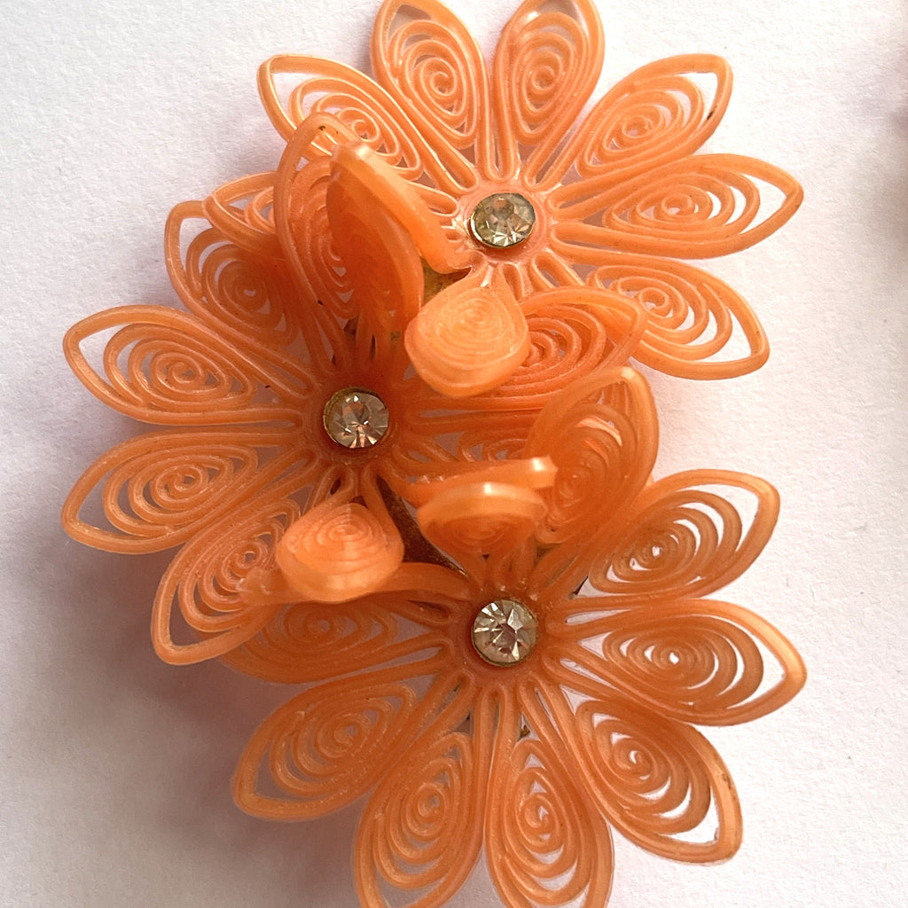 Step back in time to the 1950's....soft plastic triple flower heads each one centred with a rhinestone. Large and impressive at 7cms x 5cms. Clip mechanism in gold tone metal, very light and comfortable to wear. In very good condition especially considering their substantial age. Gift boxed by Vintageonline.