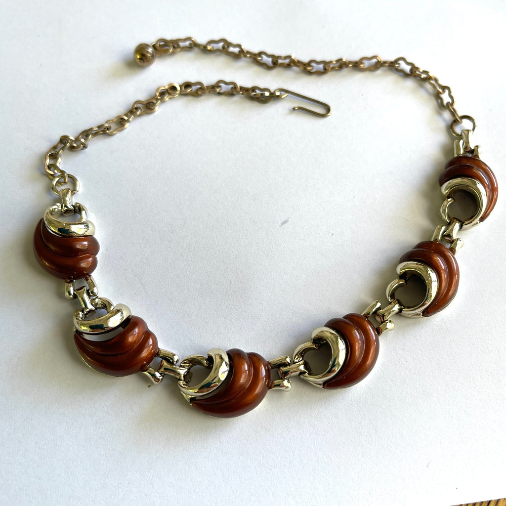 Quite unusual to find the full set still in immaculate condition. Lucite sets were very popular during the 1950's - 1960's and the lovely plastic lucite sets were mainly produced in America. The shape of each lucite section in this set has an almost art deco look. The brooch measures 5cm across with a firm roll over safety clasp to the back. Light chocolate brown set in gold tone metal. The matching necklace measures 40cms end to end finished with a firm hook clasp. An extension chain can be added if required. The earrings are clip on, and measure 3cms across. The clip mechanism is firm and comfortable. The bracelet measures 17cms end to end finished with a firm roll over clasp. All in excellent condition, gift boxed by Vintageonline. Free postage within Australia.