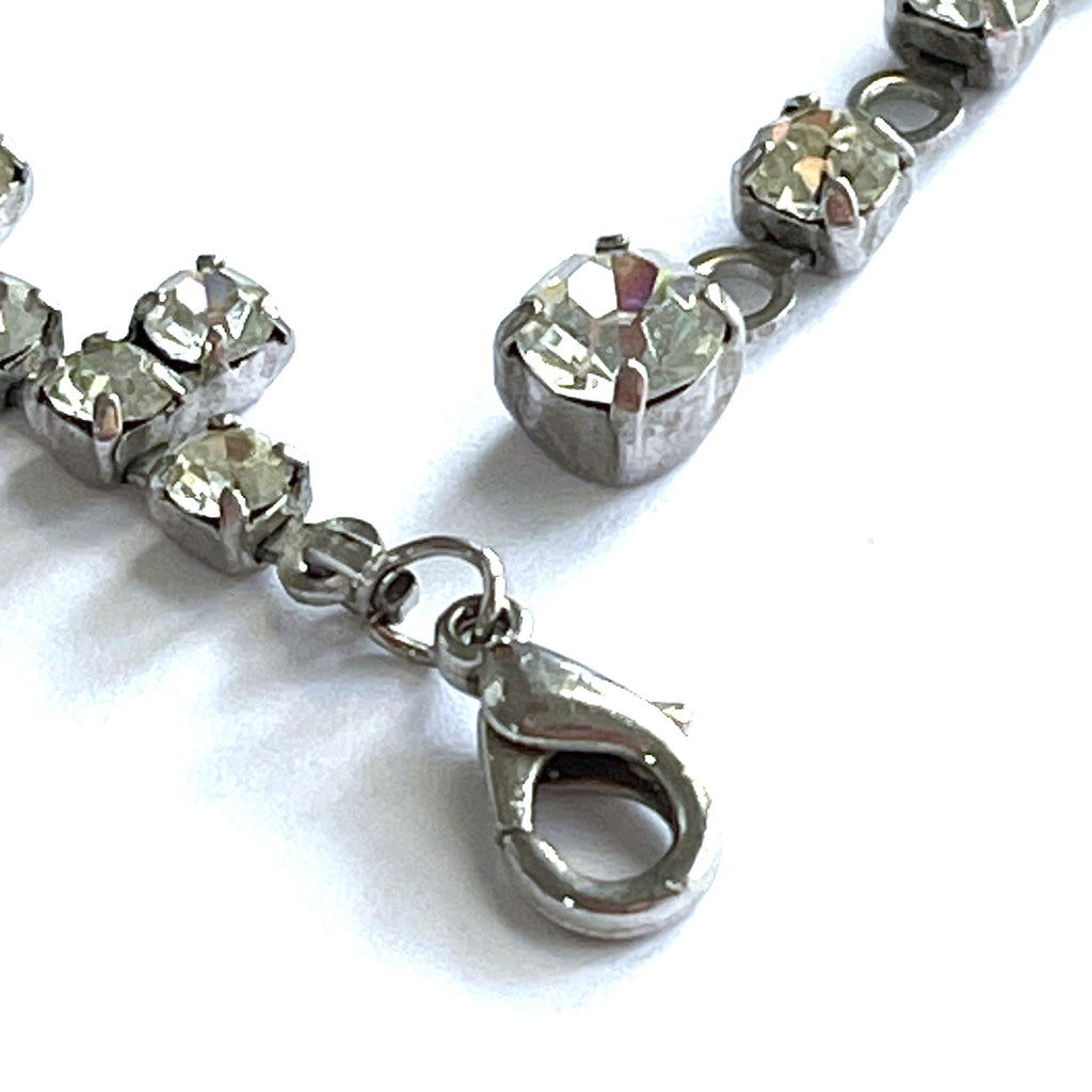 A pretty choker style necklace with 17 square discs of mother of pearl hanging from a clear rhinestone chain and each piece embellished with further rhinestones. It is in very good condition set in silver tone metal with a firm lobster clasp. Length of the necklace end to end is 43cms and width of the drop in the centre of the necklace is 2cms. Wearable to lift any outfit, gift boxed by Vintageonline.