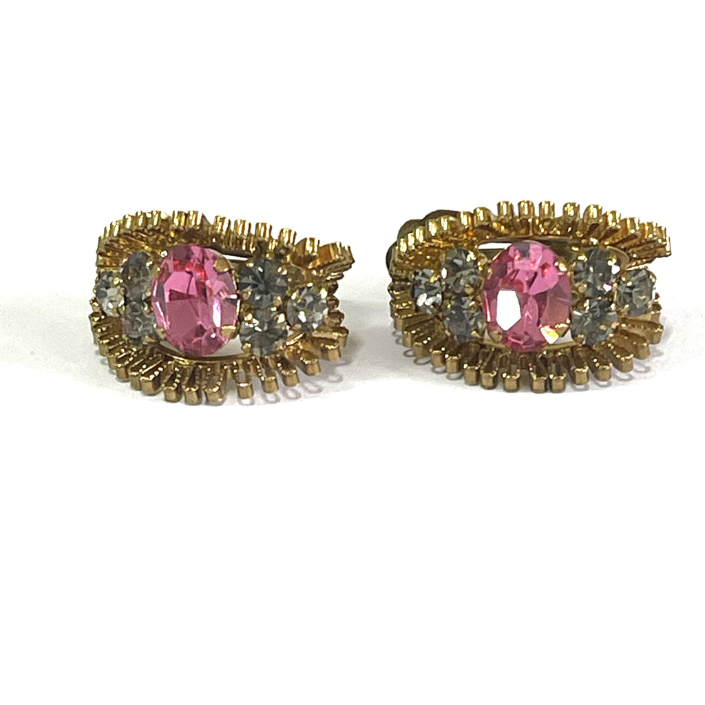 A large deep pink fully faceted rhinestone each one flanked with three clear rhinestones, set in gold tone metal. Measurement 2.5cms x 1.5cms. In good condition, with firm and comfortable clip mechanism. A very pretty pair of earrings, gift boxed by Vintageonline.