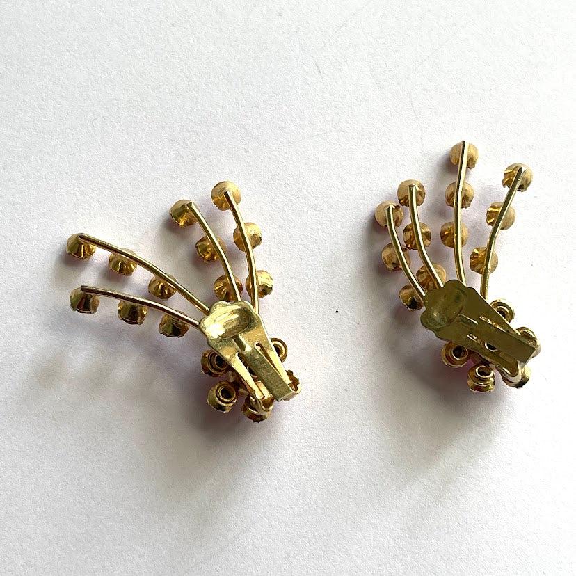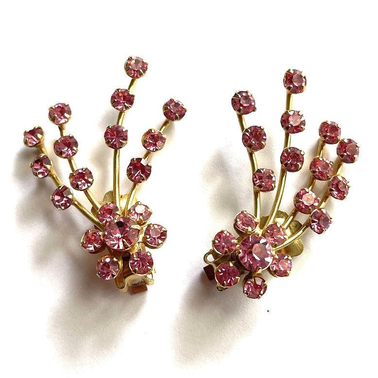 From an estate sale USA, gorgeous pink rhinestone earrings, quite substantial in size with four sprays of pink rhinestones from a pink rhinestone flower head. They have a clip on gold tone mechanism, designed to spray up the ears. In perfect new condition. Very stylish, with each rhinestone faceted and prong set in gold tone metal. The fit is firm and comfortable. Overall measurement of each earring is 4.5cms x 4cms. Gift boxed by Vintageonline.