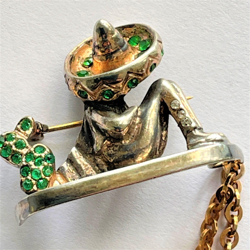 A rare find, a solid combination in gold tone metal of a sleeping Mexican with chain connection to a palm tree and crescent moon. It can be worn as a cardigan clip worn from one side to the other, or as a double brooch. The vibrant green rhinestones enhance the Mexican hat, cactus and the palm tree, with clear rhinestones in the crescent moon. Both brooches have a solid roll over clasp to the back. It is in very good condition. A recent acquisition from USA. Dimension of the Mexican is 3cms x 3cms. Dimension of the palm tree is 6cms x 4cms. So hard to find. A gorgeous vintage one off. Gift boxed by Vintageonline.