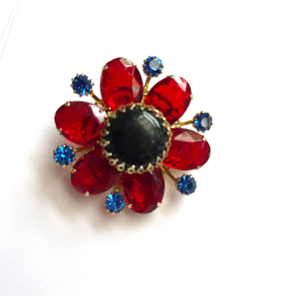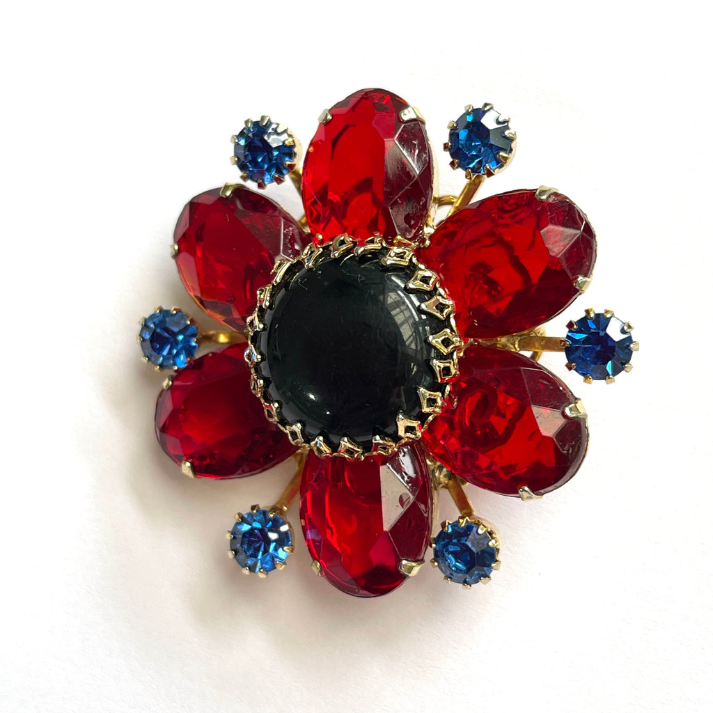 A striking brooch with large vibrant red rhinestones each one faceted and prong set. Between each of the red rhinestones is a smaller sapphire blue rhinestone and the brooch is centred with a glossy black cabochon stone set in filigree gold tone metal. There is a very attractive viligreed backing in gold tone metal along with a firm roll over safety clasp. Dimension across is 5cms. A quality piece in good condition, gift boxed by Vintageonline.