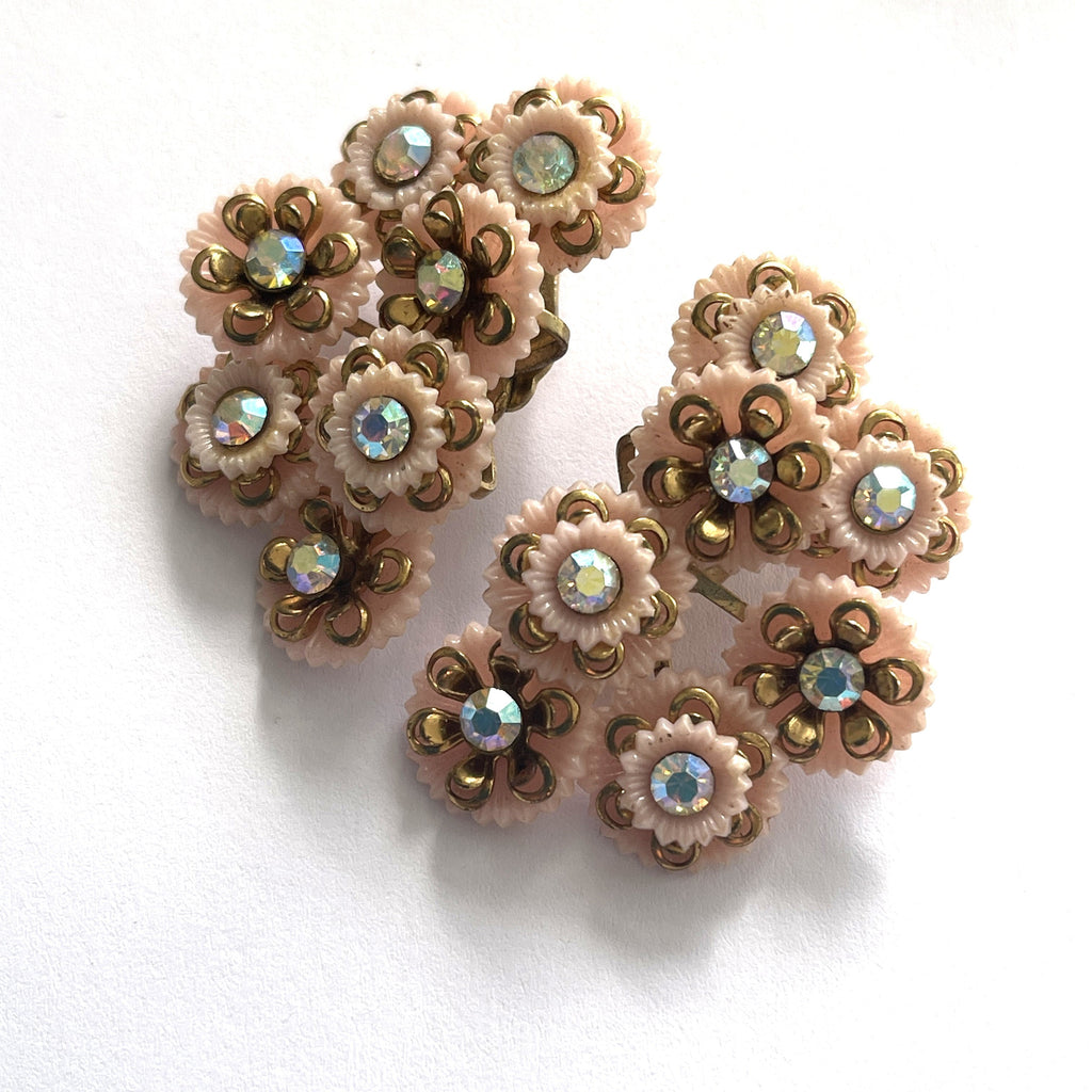 Large pink plastic earrings embellished with flower head shapes with a centred rhinestone with aurora borealis coating to catch the light. Such an iconic great mid century look. They are clip ons with a comfortable and firm gold tone clip. Measurement of each earring is 4cms x 3cms. An authentic gorgeous gift for someone who enjoys a mid century look. In very good condition, from USA. Gift boxed by Vintageonline.