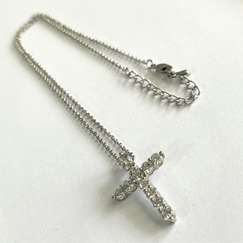 A sweet cross shaped pendent in silver tone metal set with fully faceted clear rhinestones, shiny and bright. The cross measures 3cms x 2cms and is in perfect condition. The chain measures 44cms end to end finished with a firm lobster class. Also in excellent condition, gift boxed by Vintageonline.