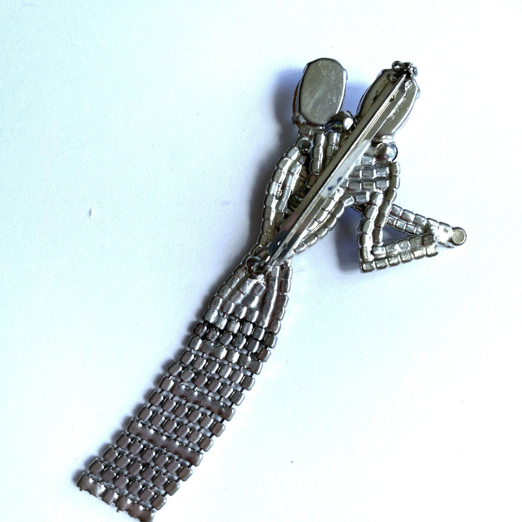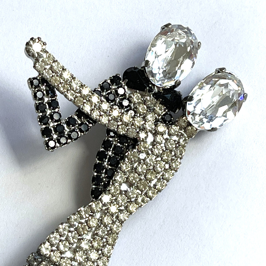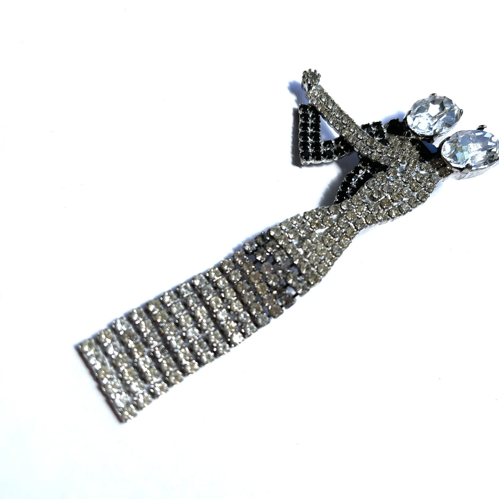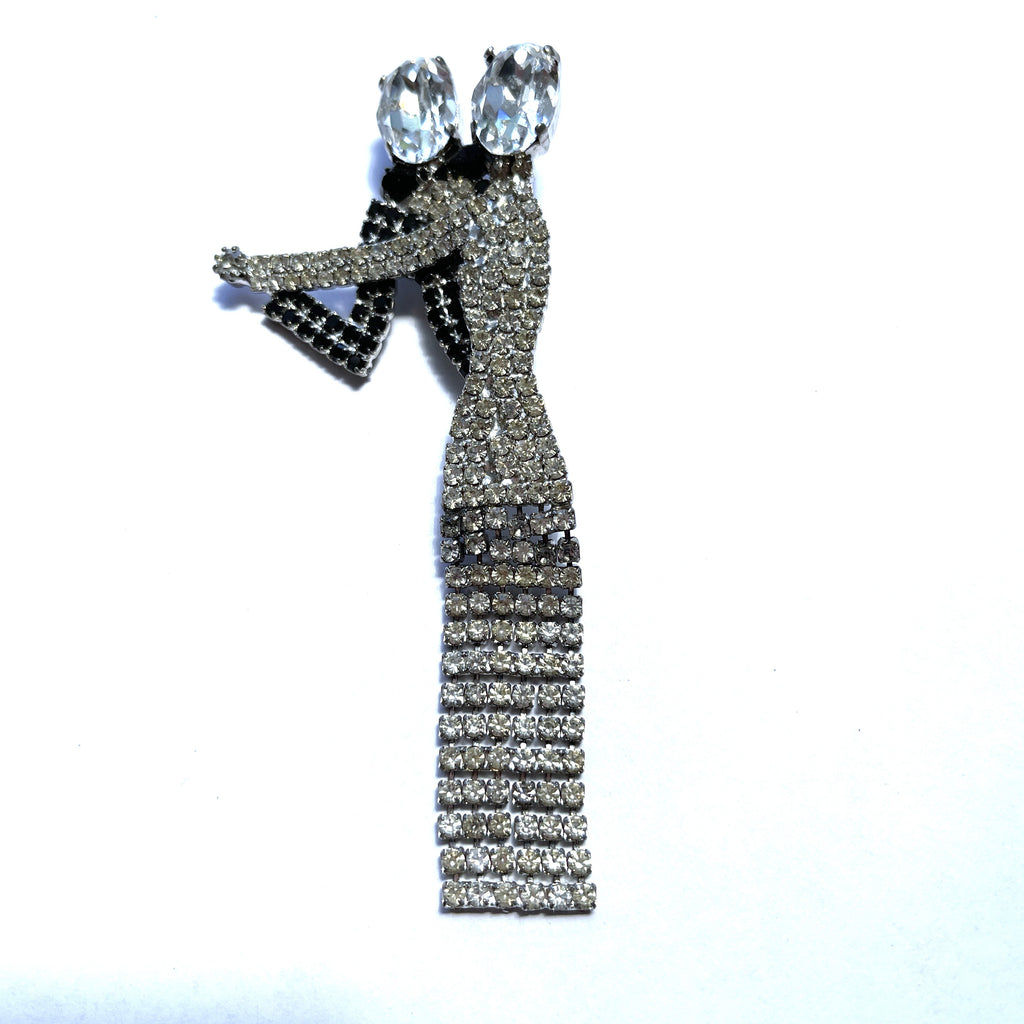 The rhinestone dancing couple in rhinestones, recently arrived from the UK has been produced by more than one company. It is unsigned, a combination of black rhinestones for the mans jacket along with his bow tie and clear rhinestones for the lady. Quite substantial in size at 10cms in length and 4cms across at the widest point. Condition is sparkly and bright with the exception of only one tiny rhinestone in the lady's skirt which has darkened a little over time. Mentioned for accuracy. There is a firm roll over safety clasp to the rhodium plated back. Produced in the 1990's period. Gift boxed by Vintageonline.